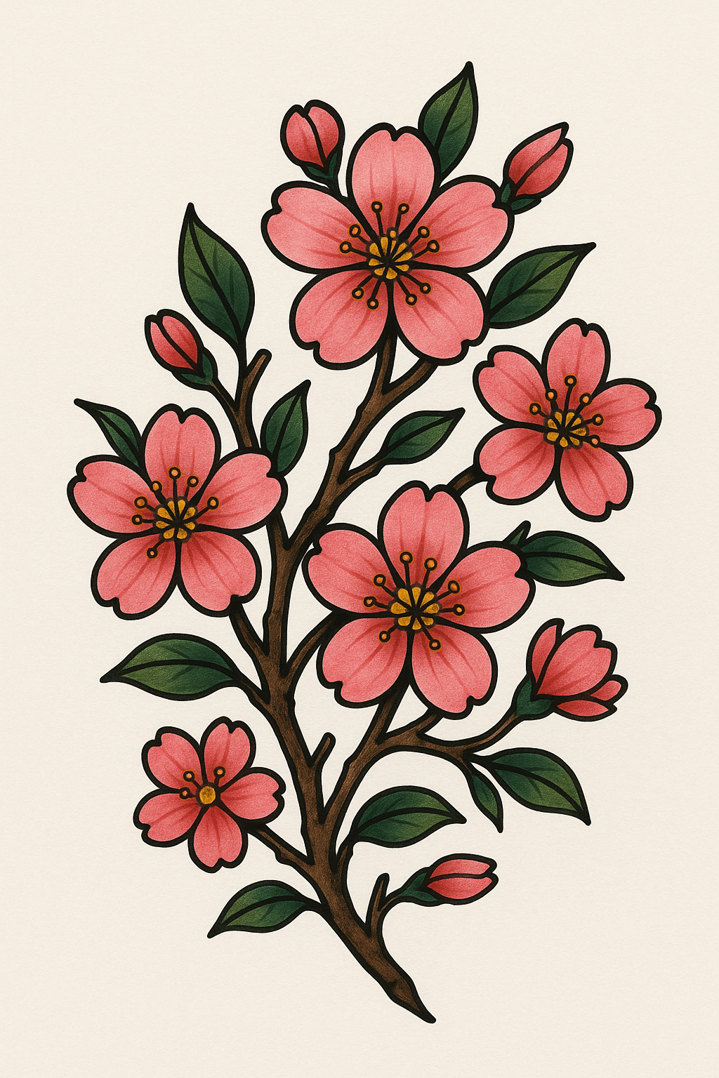 Vintage Cherry Blossom Tattoo Design with Floral Elements