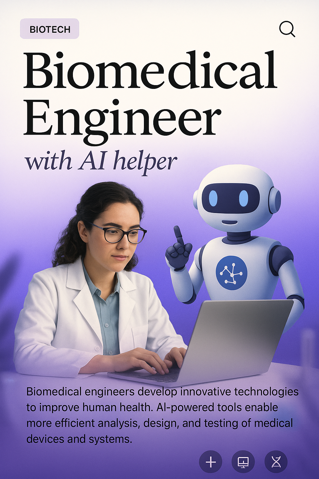 /Collection: /by davooda/Type: PNG/An engaging scene featuring a biomedical engineer working alongside an AI assistant. The engineer is focused on a laptop, while the AI character symbolizes innovation in healthcare.