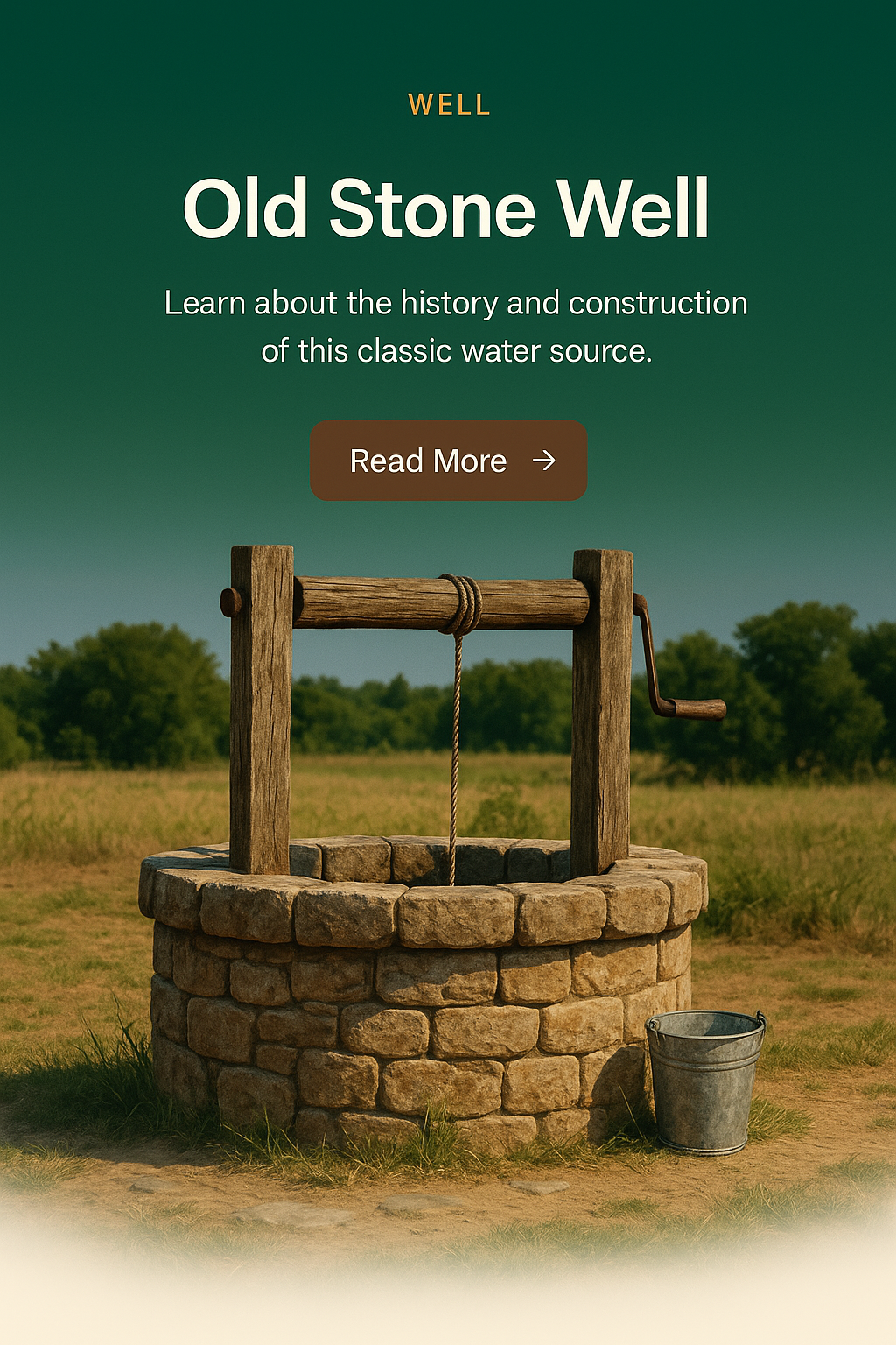 /Collection: /by davooda/Type: PNG/A minimalist web design showcasing an Old Stone Well, set in a natural environment. The layout includes a concise title, informative text block, and a clear action button.