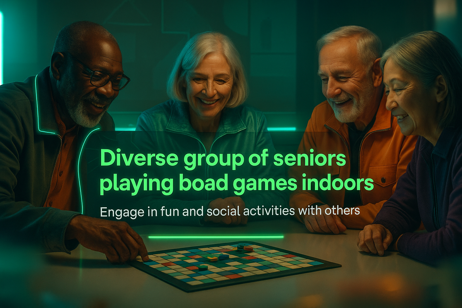 A warm and inviting image depicting a diverse group of seniors enjoying board games indoors, highlighting social interactions and fun activities. Perfect for community or senior living promotions.