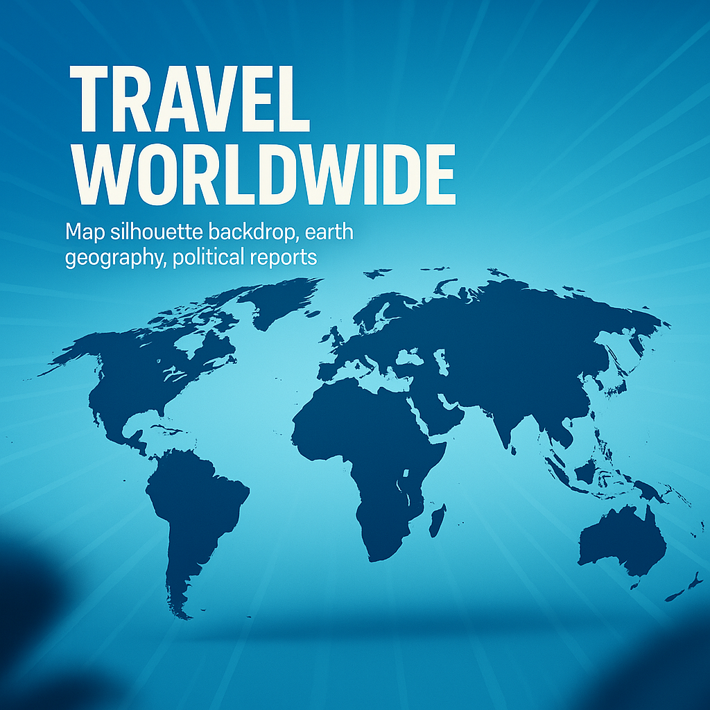 /Collection: /by davooda/Type: PNG/This is a digital graphic featuring a silhouette of a world map on a blue gradient background. It is ideal for travel-related content, educational purposes, or political reports.