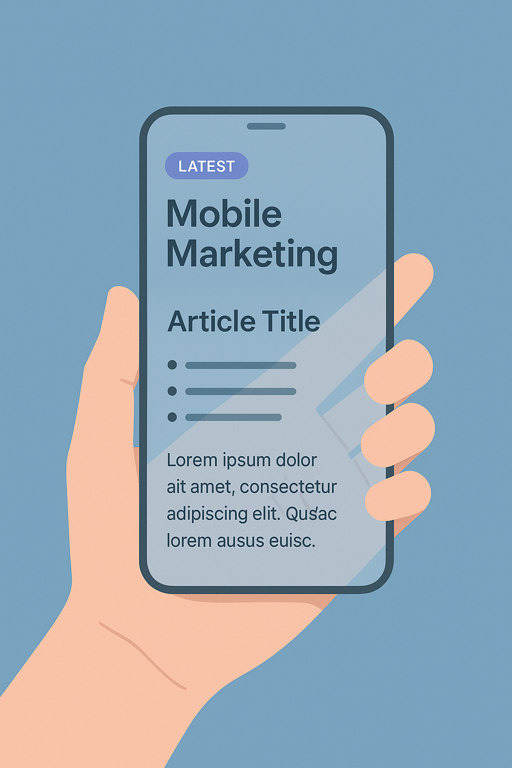 A modern illustration of a smartphone held in hand, showcasing a mobile marketing article layout. The clean design and soft color palette make it suitable for digital marketing presentations.