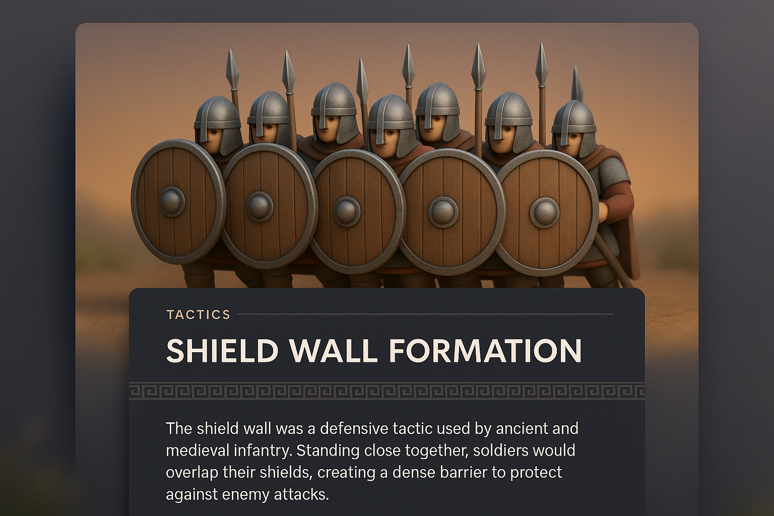 A 3D illustration depicting a shield wall formation used by ancient infantry. The soldiers stand closely, overlapping their shields for protection, set against a smooth gradient background.