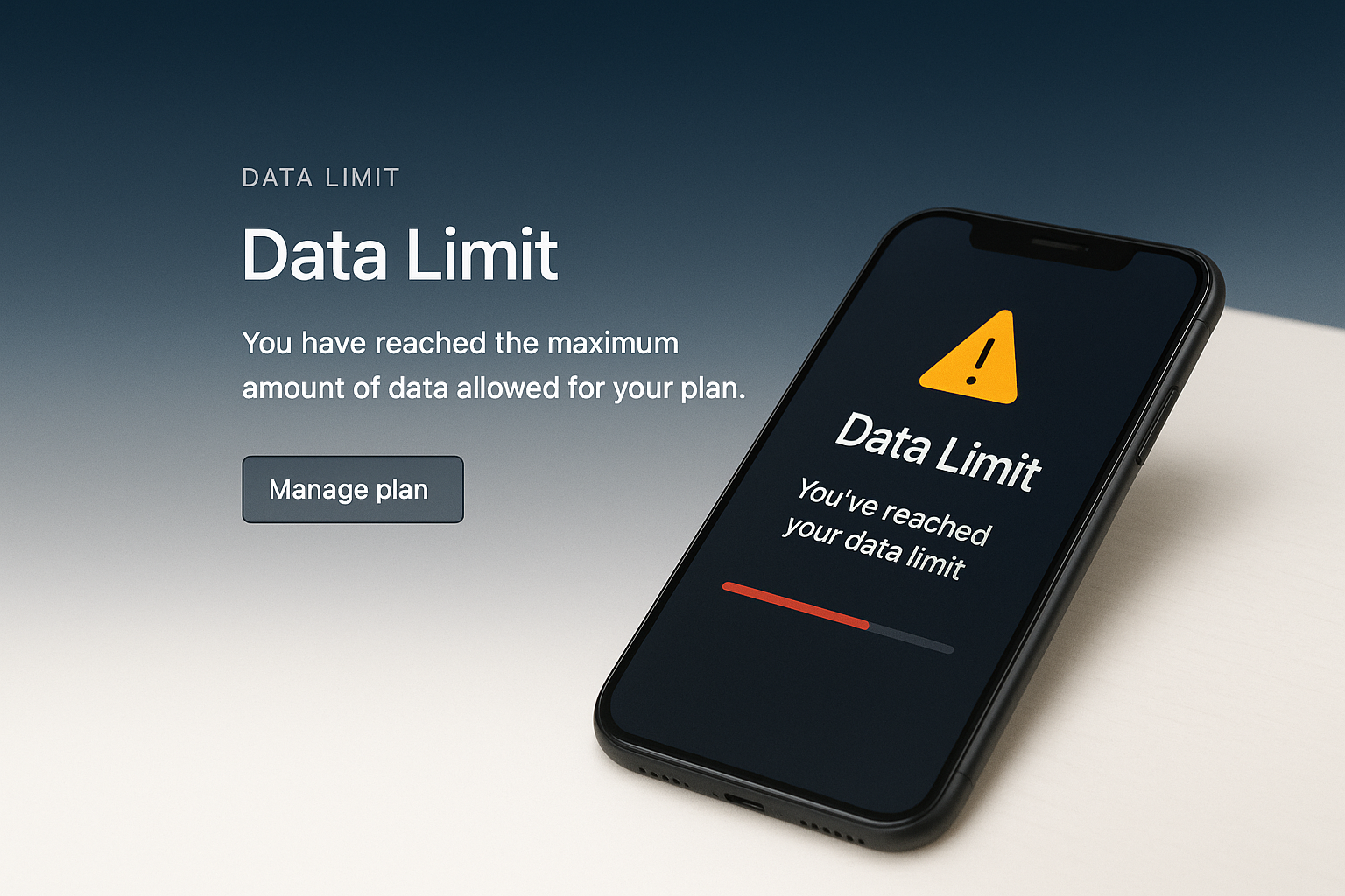 /Collection: /by davooda/Type: PNG/A sleek web page design featuring a smartphone with a data limit notification. The background transitions from dark to white, ensuring readability and focus on the message.