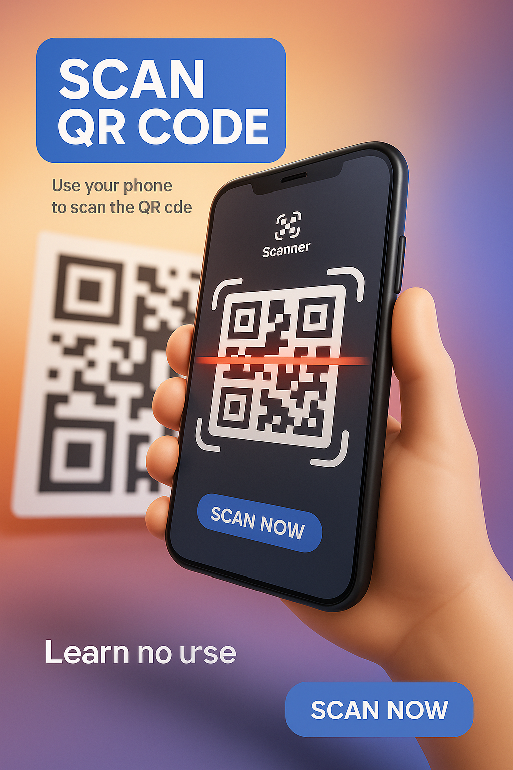 This is a digital promotional graphic showcasing a mobile phone displaying a QR code, designed to encourage users to scan the code. The style is modern and vibrant, appealing to tech-savvy audiences.
