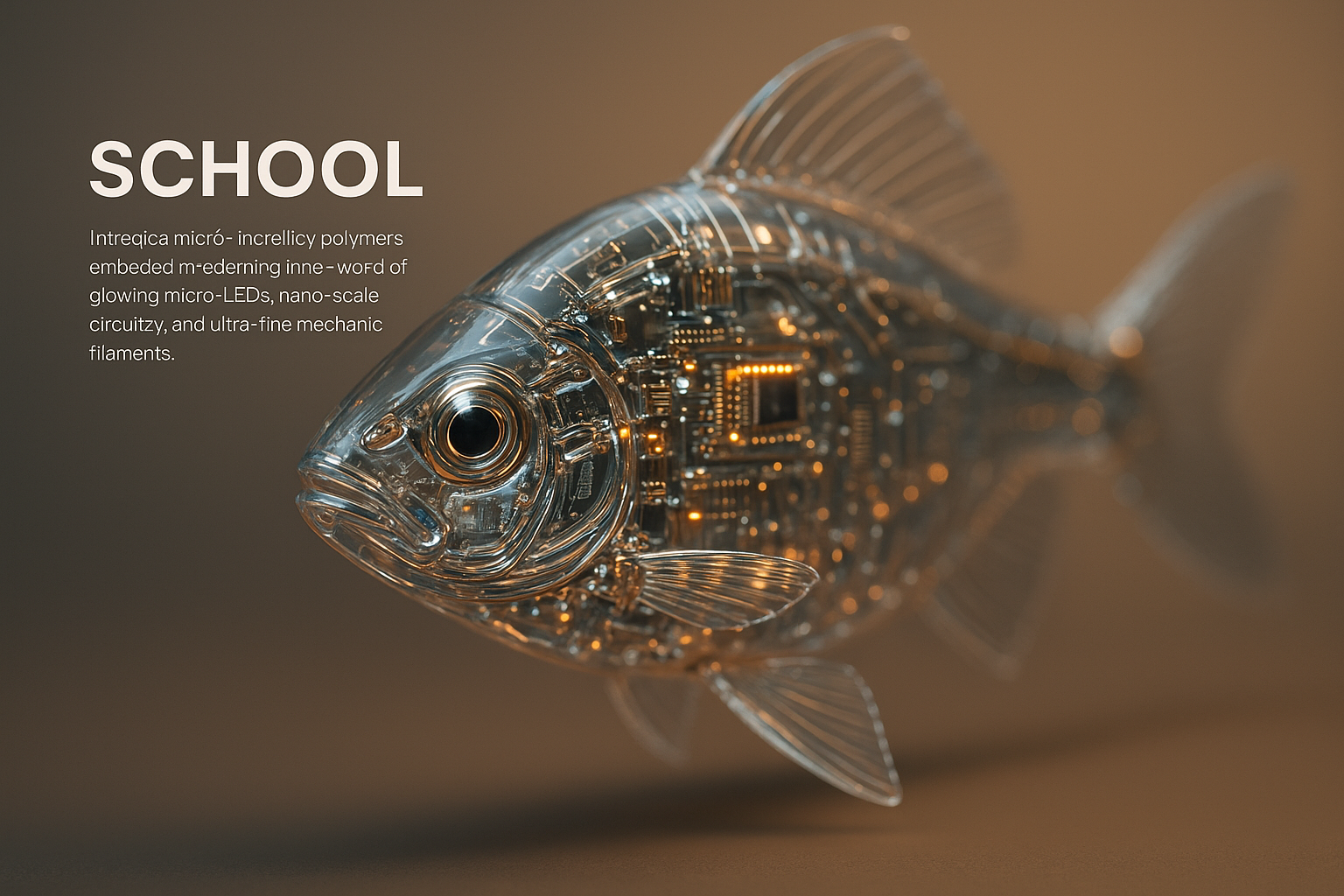 /Collection: /by davooda/Type: PNG/A stunning hyperrealistic sculpture of a fish, crafted from clear polymers that showcase intricate inner circuitry and glowing micro-LEDs. The design features metallic elements reflecting light beautifully.