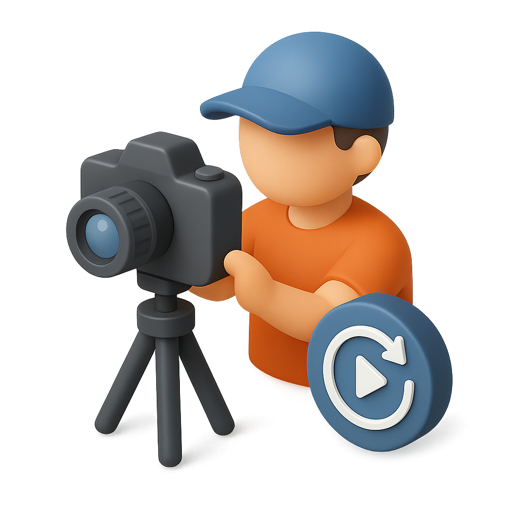 A stylized 3D icon depicting a time-lapse photographer holding a camera on a tripod. The figure wears an orange shirt and blue cap, set against a soft gradient background.