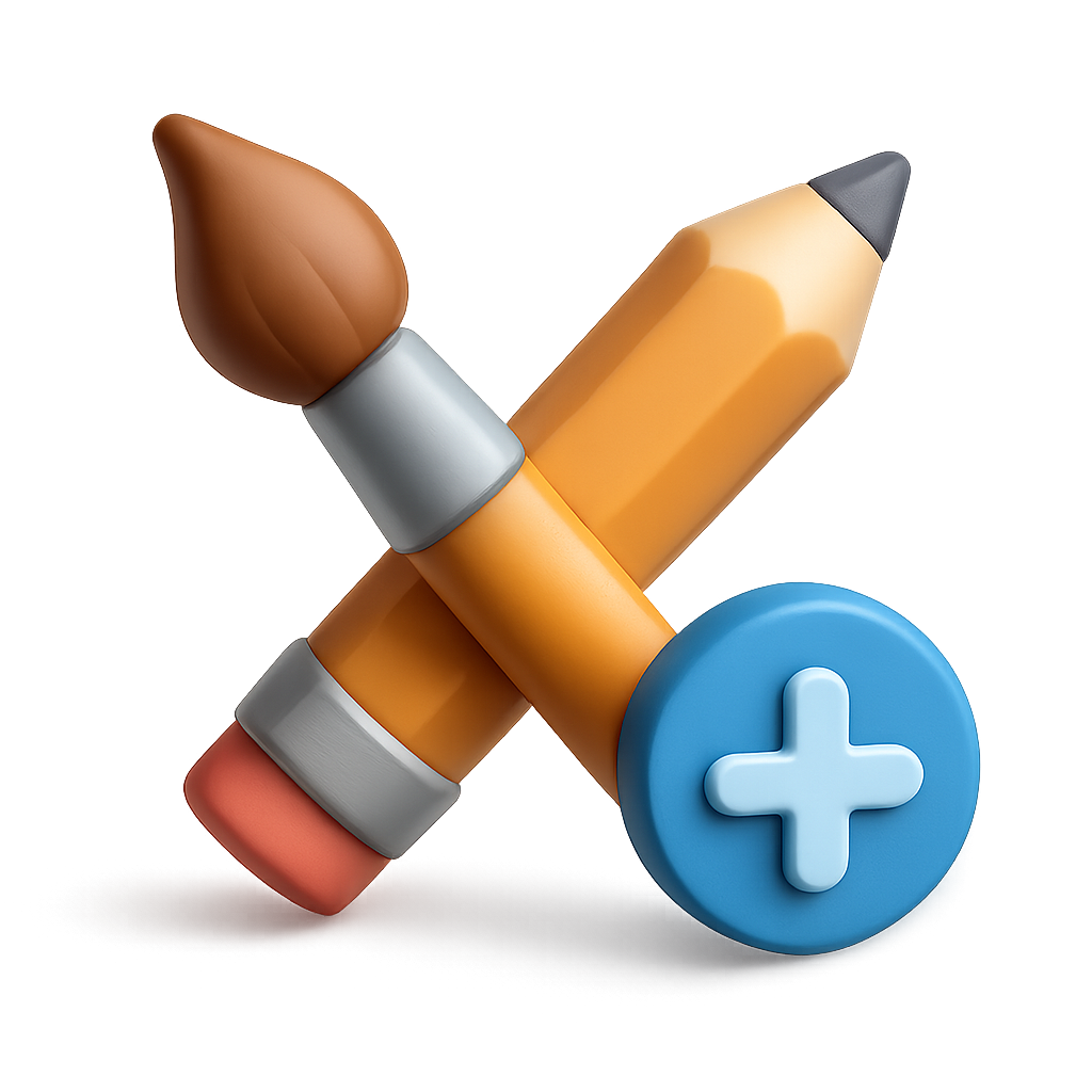 A vibrant 3D illustration featuring a paintbrush and pencil crossed over a circular blue plus icon, set against a soft gradient background, emphasizing a playful artistic theme.