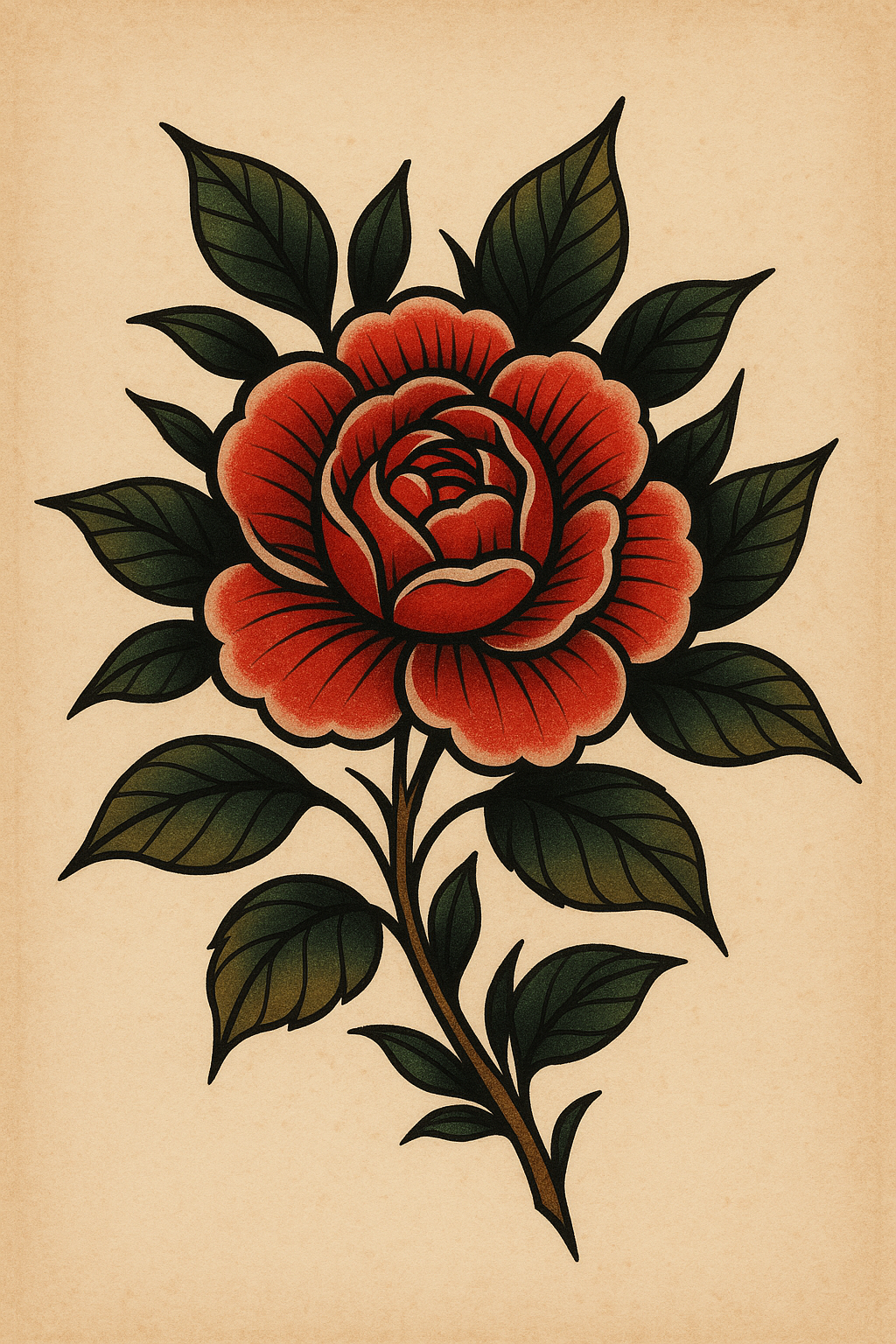 This is a vintage-inspired tattoo design featuring a detailed red rose and green leaves. Ideal for tattoo artists or art enthusiasts.