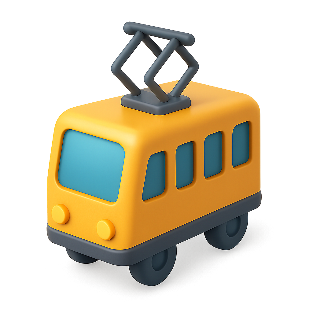 A vibrant 3D icon of a tram, featuring a yellow body, blue windows, and a unique overhead design, set against a dark gradient background for emphasis.