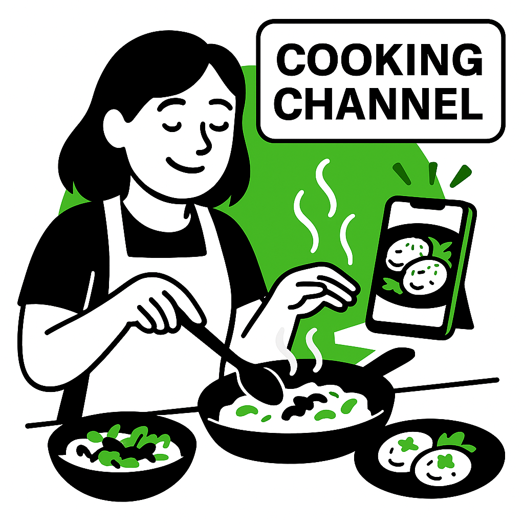 Stylized illustration depicting a chef cooking and showcasing a cooking channel theme. Ideal for culinary content and social media promotion.