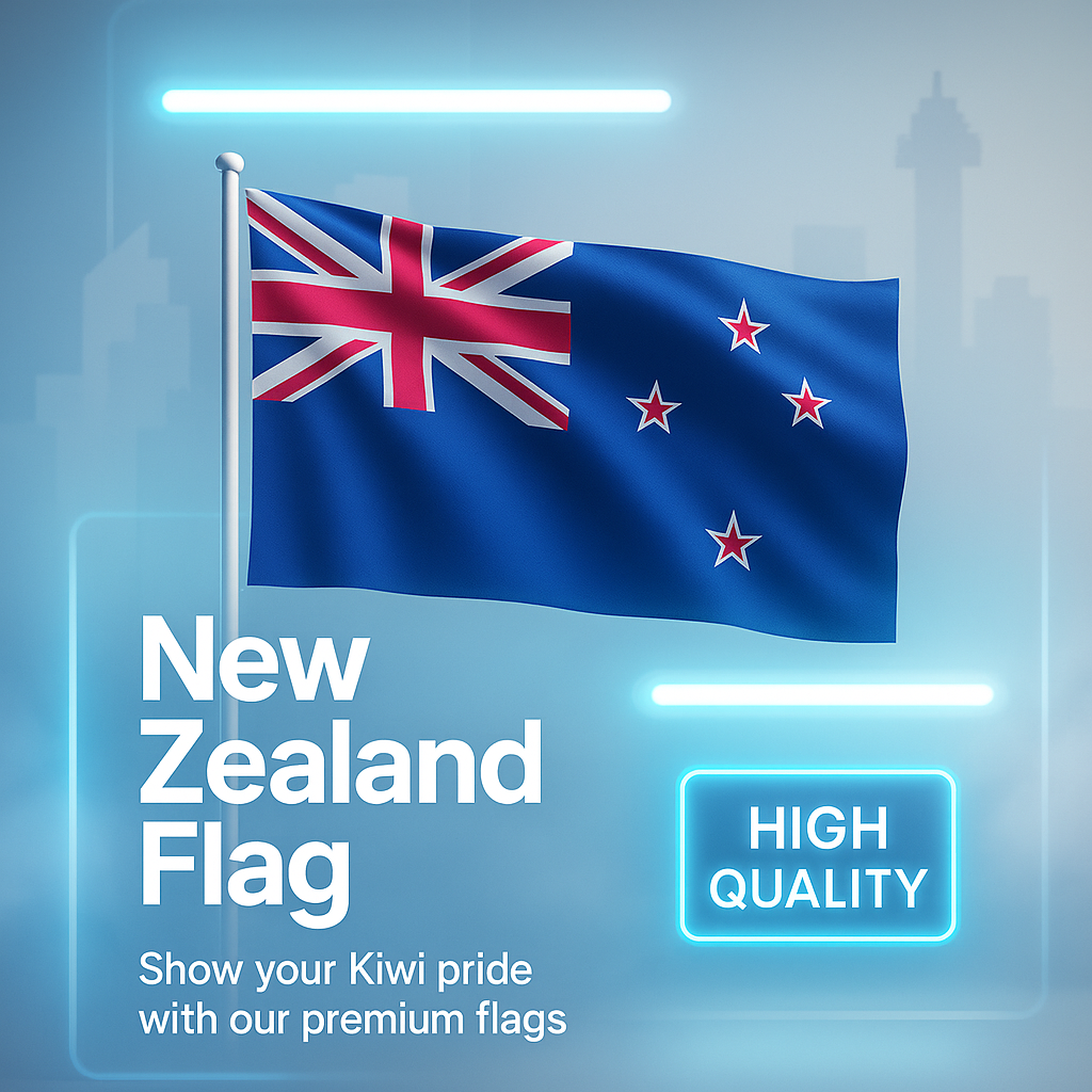 Promotional image showcasing a New Zealand flag with a modern design. Ideal for advertising premium flag products, targeting patriotic customers.