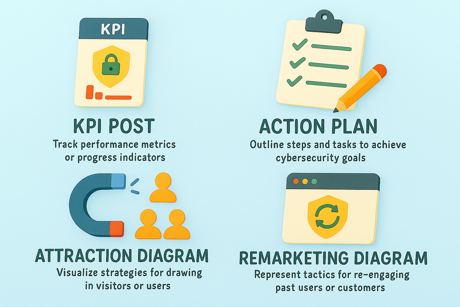 /Collection: /by davooda/Type: PNG/Colorful infographic representing various cybersecurity concepts, including KPI tracking, action planning, user attraction strategies, and remarketing tactics. Ideal for educational or marketing materials.