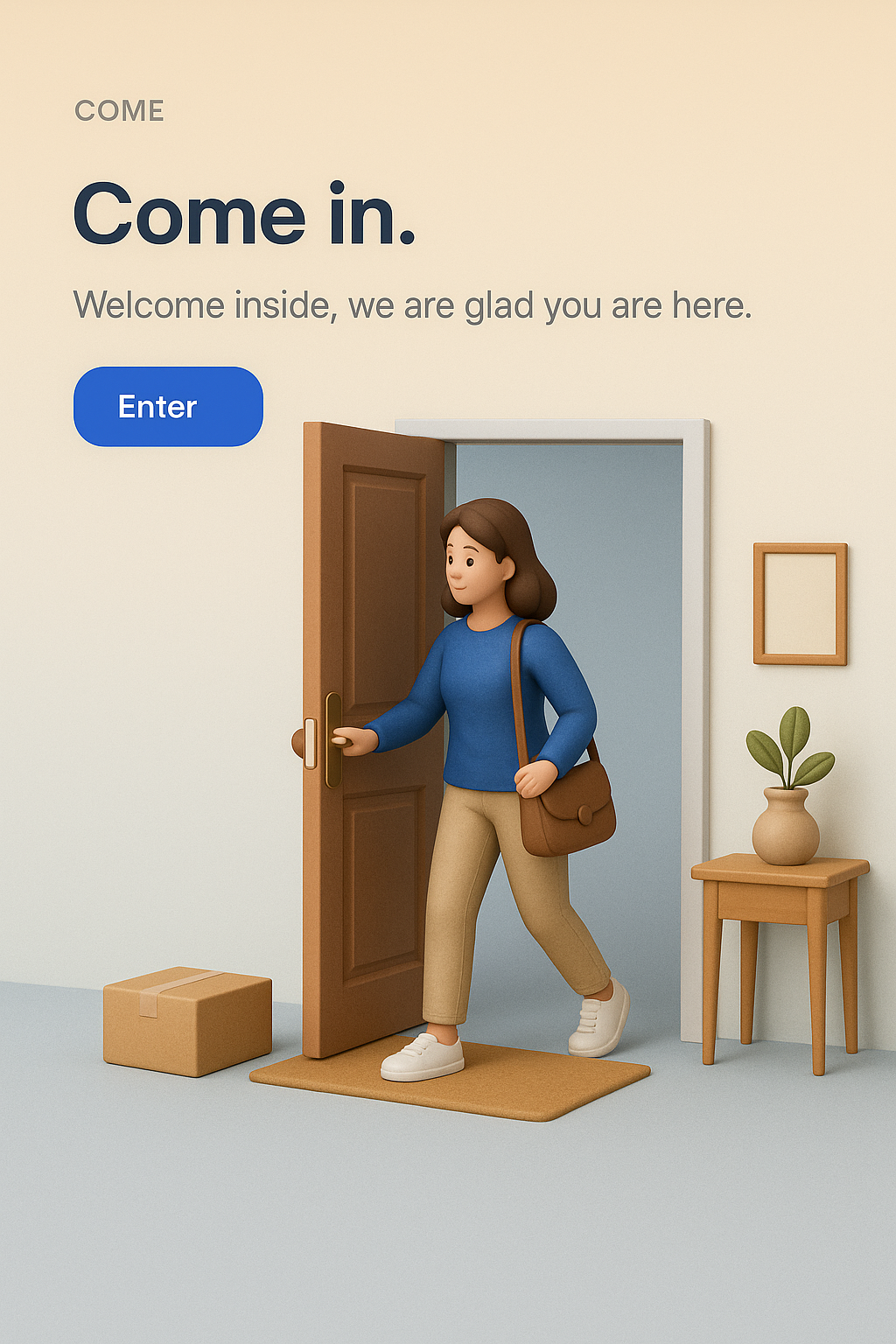 A vibrant 3D illustration depicting a person entering a room, with a warm welcome message. The scene features a door, a small table, and a plant, all in a zoomed-out perspective.