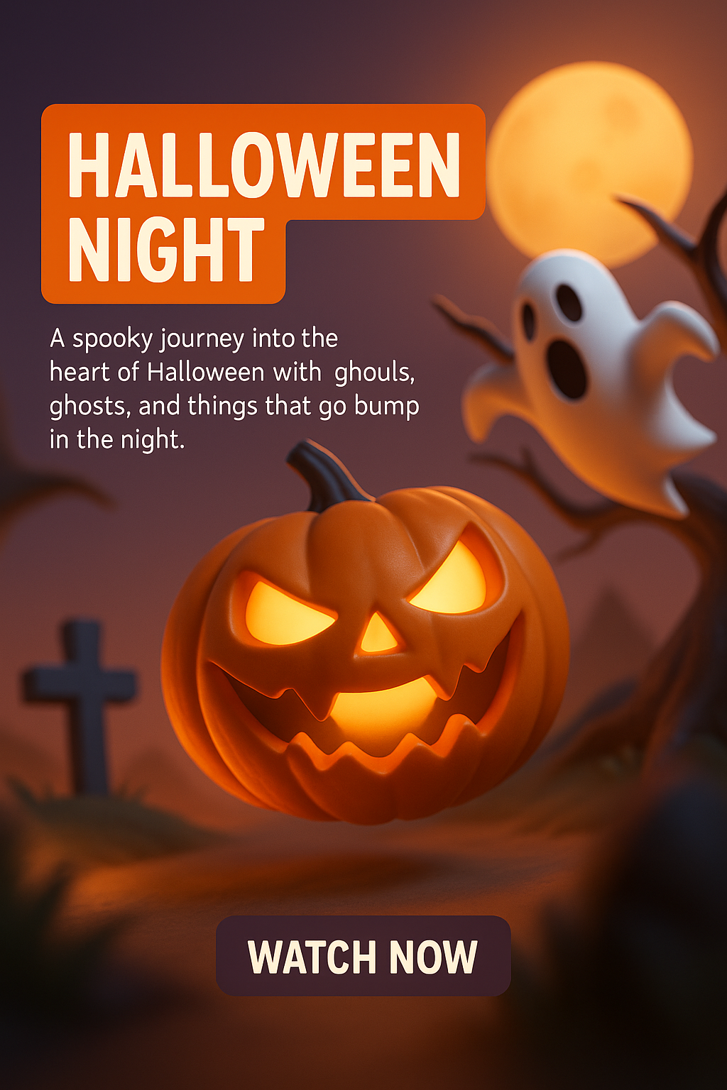 /Collection: /by davooda/Type: PNG/A visually engaging social media post designed for Halloween, featuring a carved pumpkin, a ghost, and a spooky night scene. Ideal for promoting Halloween events or themed content.