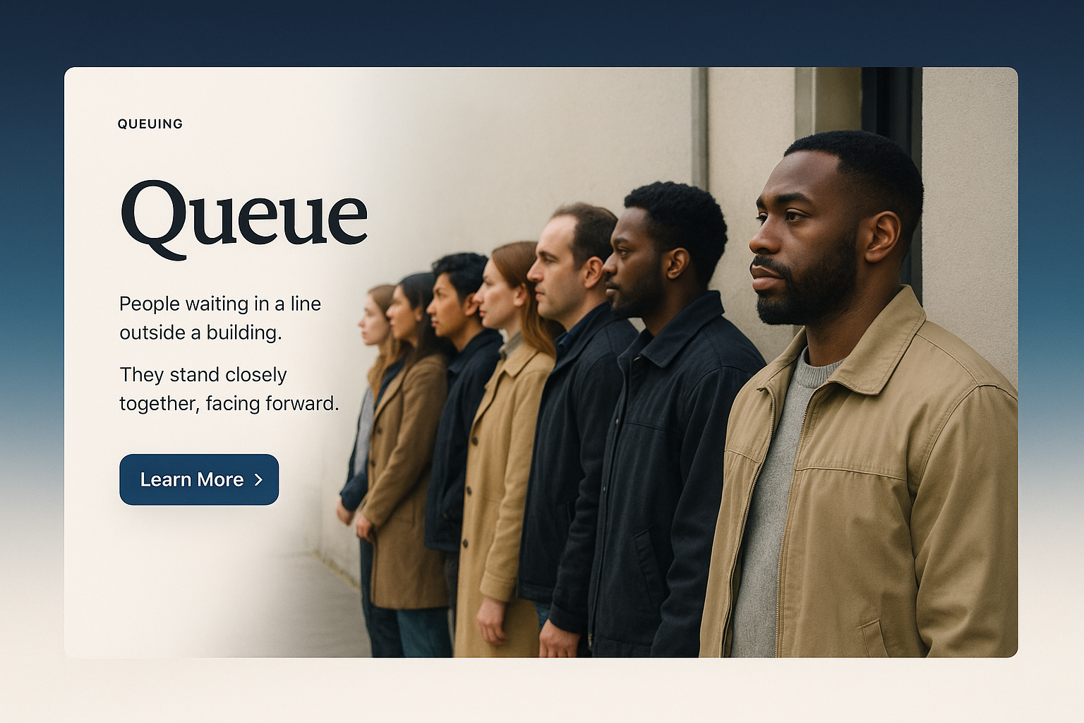 A modern webpage design showcasing a diverse group of people queuing outside a building. The layout includes a clear action button and concise text, emphasizing readability.