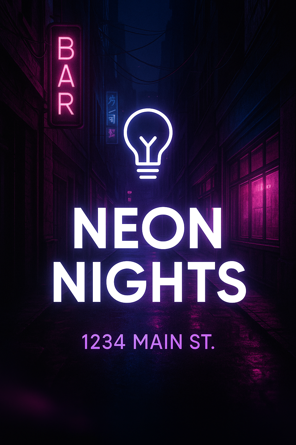 A striking event poster featuring neon lighting and a moody urban backdrop, ideal for nightlife promotions. The design uses bold typography and vibrant colors to attract attention.