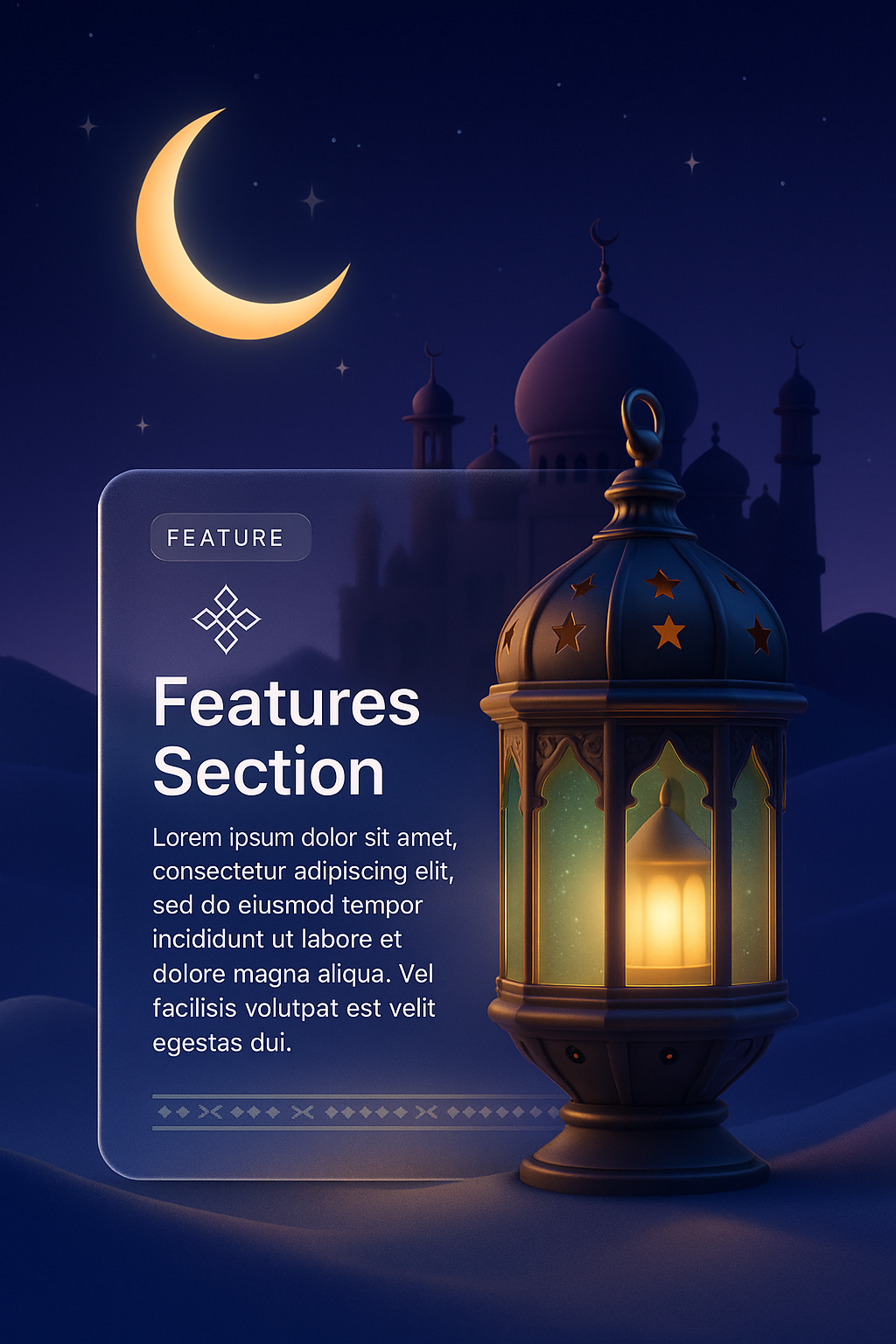 /Collection: /by davooda/Type: PNG/A serene desert scene at night featuring illuminated lanterns, a mosque silhouette, and a crescent moon. The design incorporates a modern features section with a subtle glass effect.