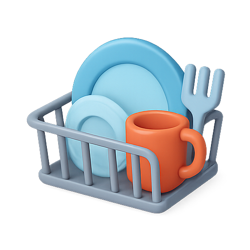 A playful and modern illustration of a dish rack featuring stacked plates and a mug, ideal for kitchen-related content or product showcases.