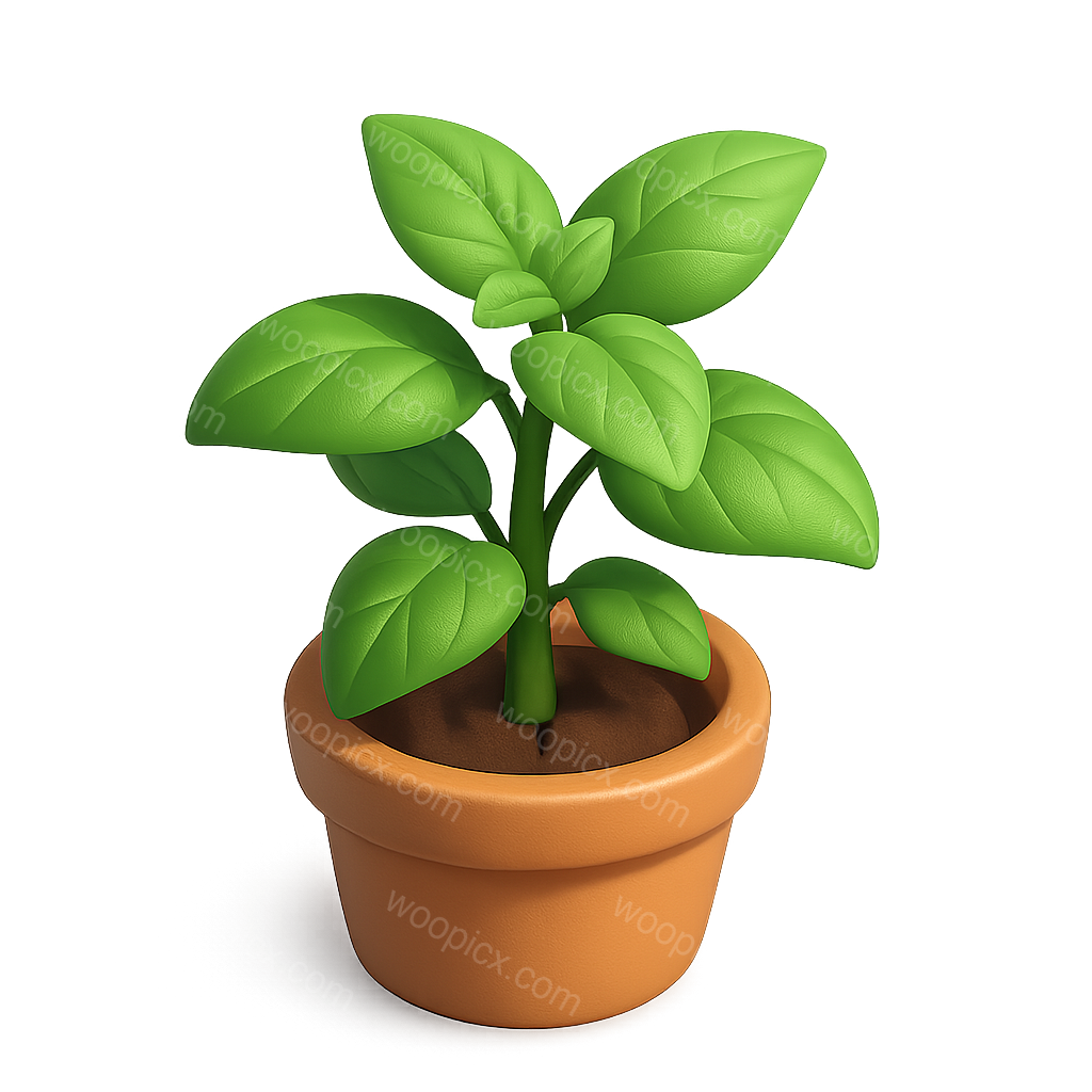 A beautifully rendered 3D icon of a basil plant in a terracotta pot, featuring vibrant green leaves and a natural look, presented in a three-quarter view.