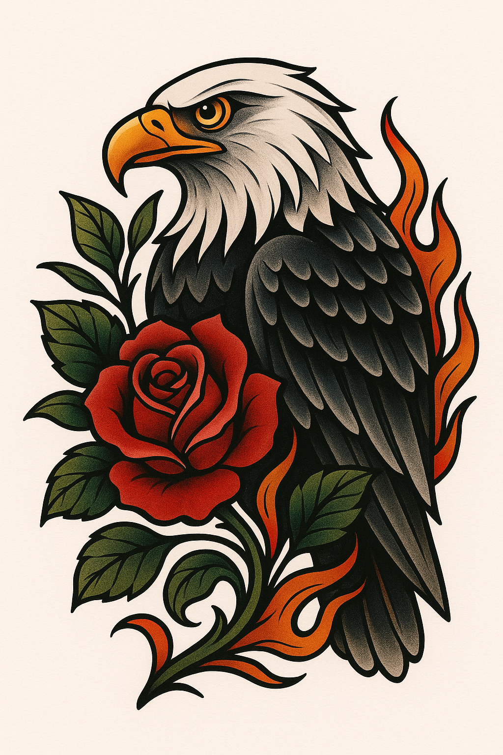 Vibrant tattoo design showcasing a majestic eagle alongside a bold red rose, accented with flames. Perfect for tattoo art enthusiasts and custom design inspiration.