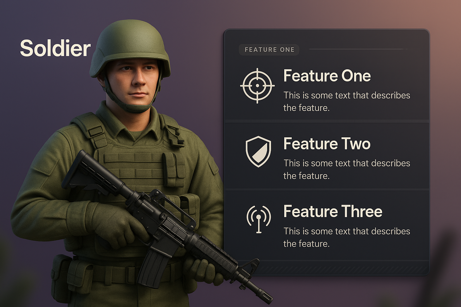 /Collection: /by davooda/Type: PNG/A realistic 3D rendering of a soldier holding a firearm, accompanied by a dark panel featuring three highlighted features with descriptions. The background smoothly transitions in color, emphasizing the subject.