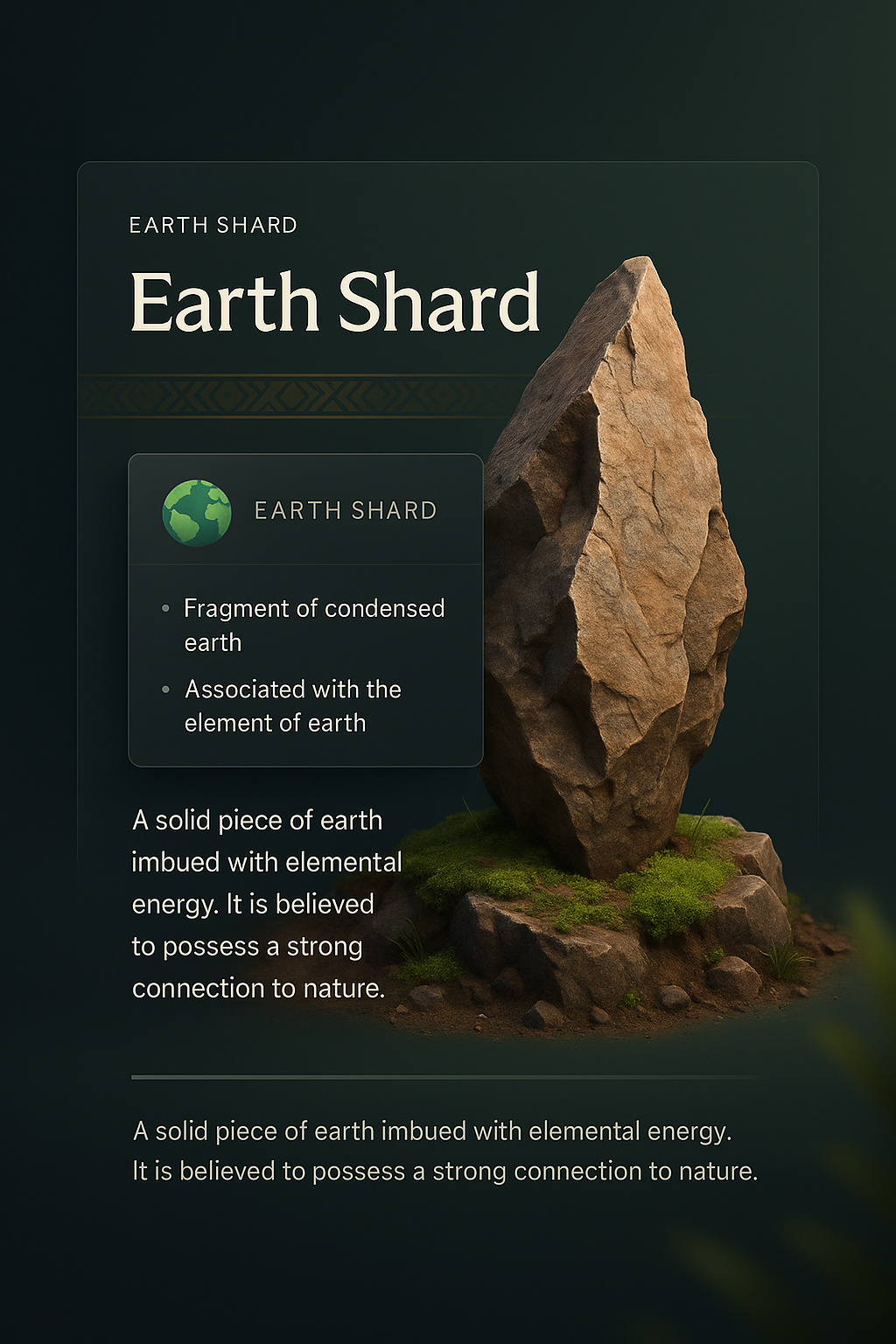 A stunning 3D illustration of an earth shard, showcasing its connection to elemental energy. The design features a layered composition with a gradient background and informative text blocks.