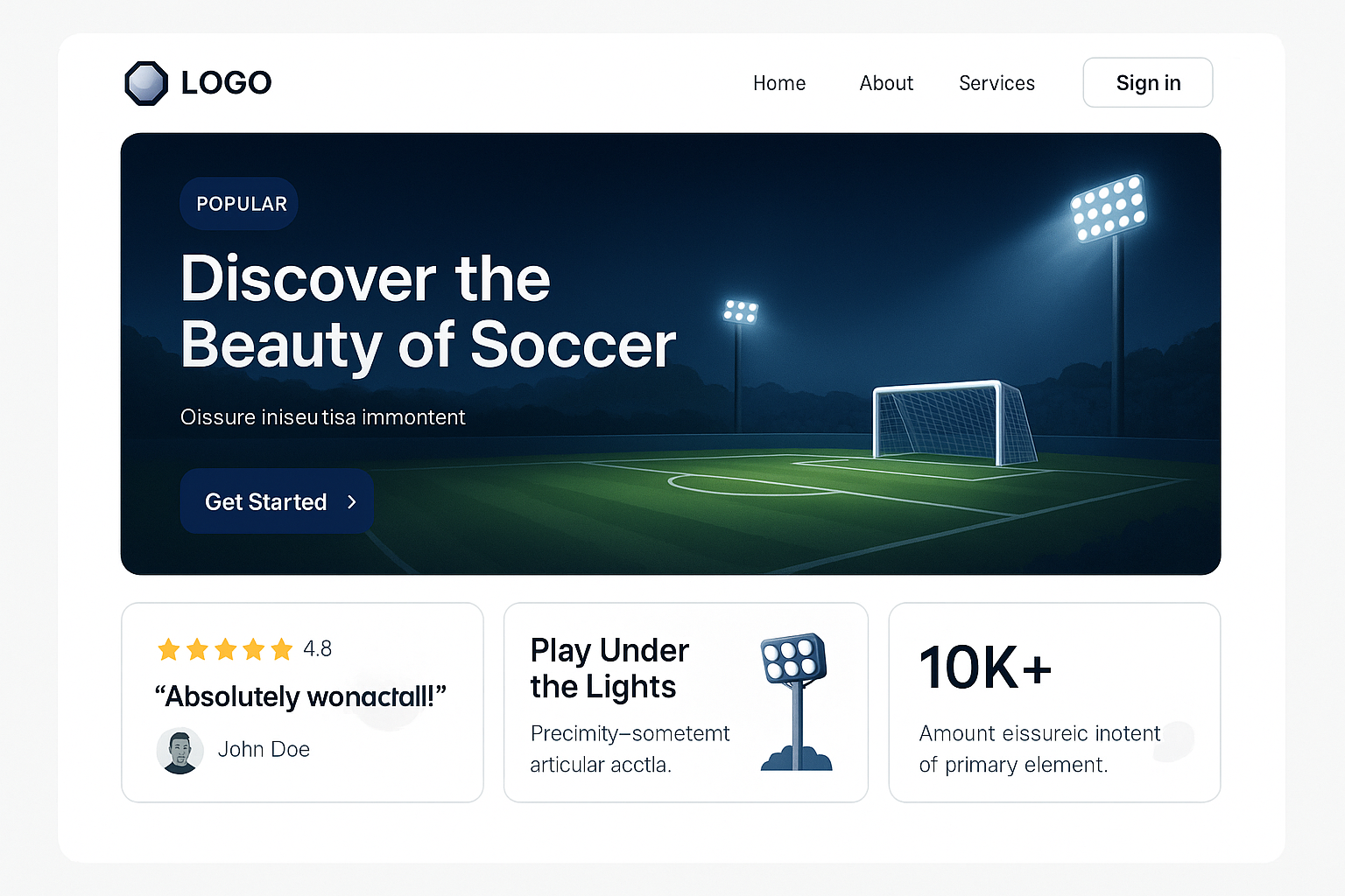 A modern landing page design featuring a 3D illustration of a soccer field at night. Includes sections for user testimonials, features, and statistics.