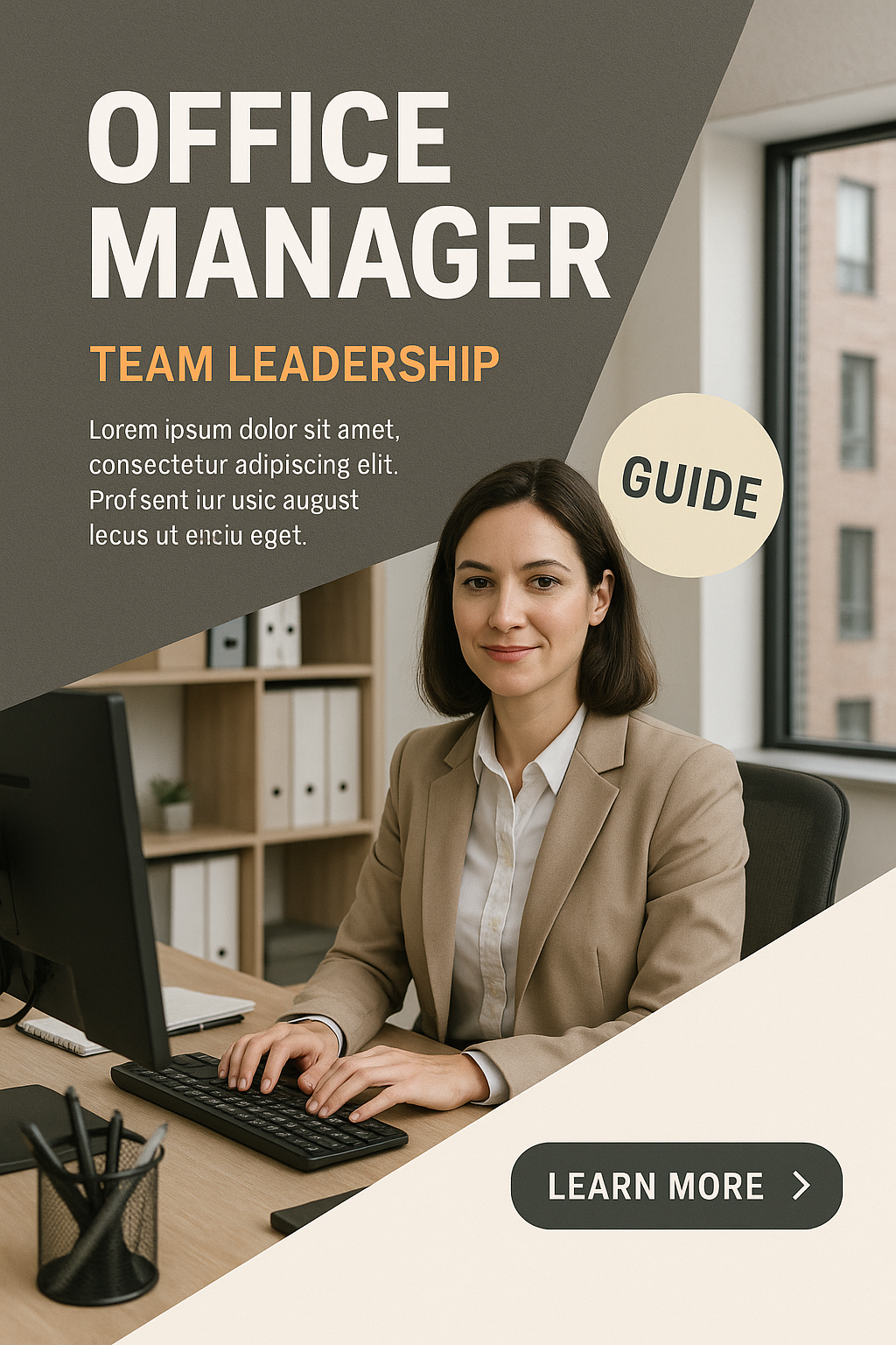 /Collection: /by davooda/Type: PNG/A visually appealing office manager guide featuring a professional woman seated at a desk. The design includes a balanced layout with contrasting colors, clear text hierarchy, and a call-to-action button.