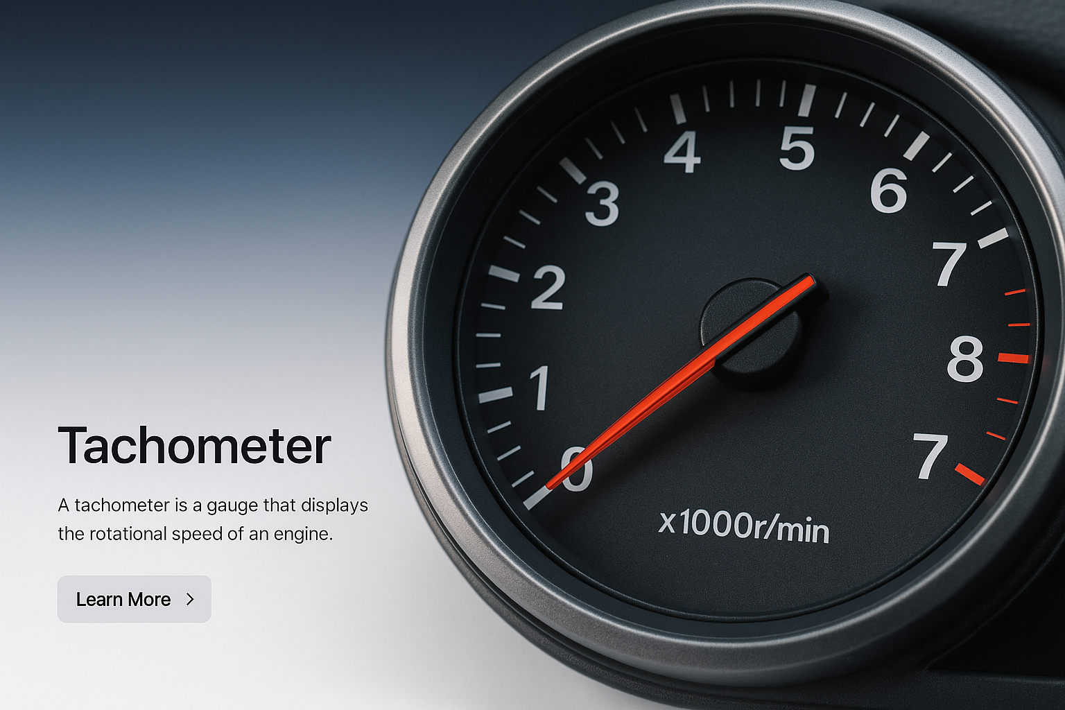 A sleek tachometer displays engine speed in a modern design. The gradient background enhances readability, featuring a clean layout with a call-to-action button.