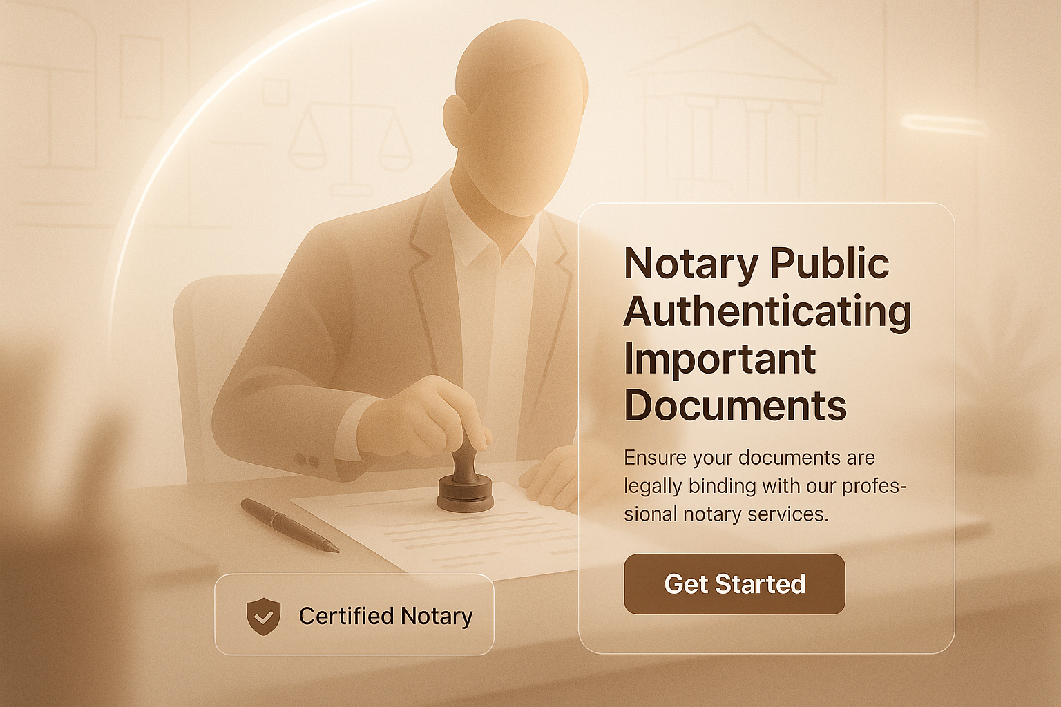 /Collection: /by davooda/Type: PNG/Stylized promotional graphic for notary public services featuring a faceless figure stamping documents. Ideal for digital marketing and legal service advertisements.