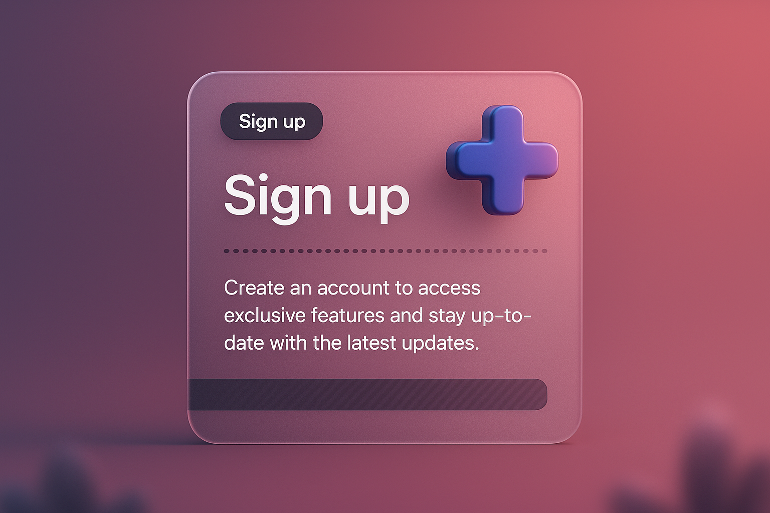A modern 3D sign-up button featuring a gradient background. The button includes a prominent plus symbol and concise text, promoting user account creation.