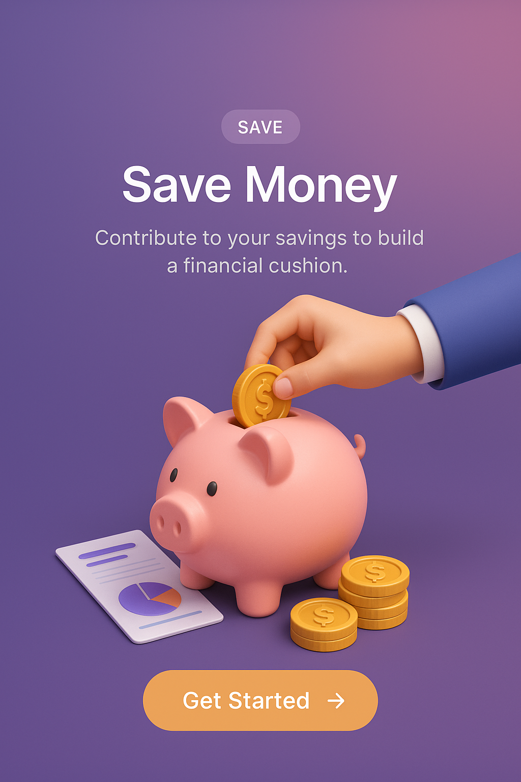 A realistic 3D illustration featuring a hand placing a coin on a piggy bank, with coins and a savings chart nearby. The design emphasizes financial themes.