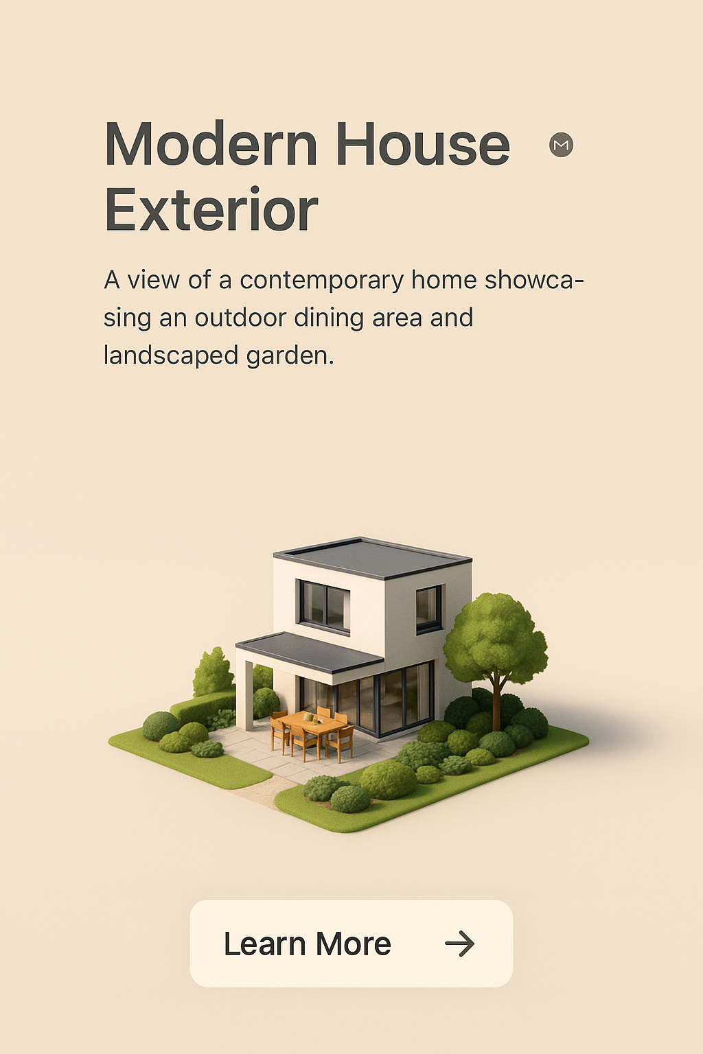 A beautifully rendered 3D scene of a modern house, showcasing an outdoor dining area and a landscaped garden, with a smooth gradient background.