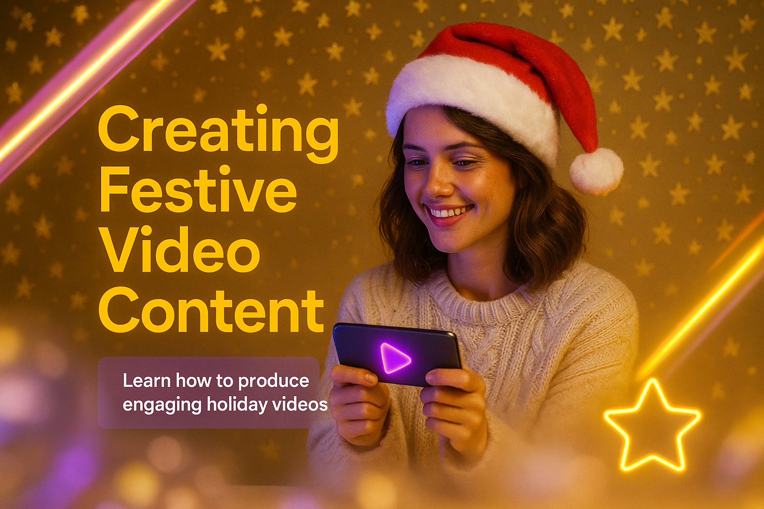 Vibrant social media post featuring a woman in a Santa hat creating video content, designed for holiday marketing, with warm colors and engaging elements.