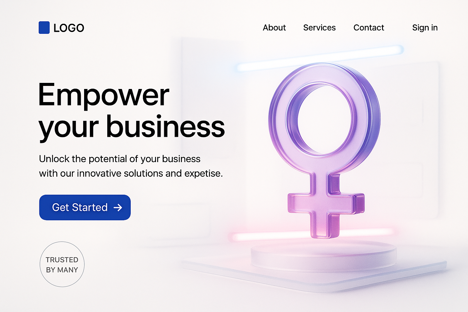 /Collection: /by davooda/Type: PNG/A visually engaging landing page featuring a glowing female symbol, promoting business empowerment. The design includes a call-to-action button and a sleek layout.