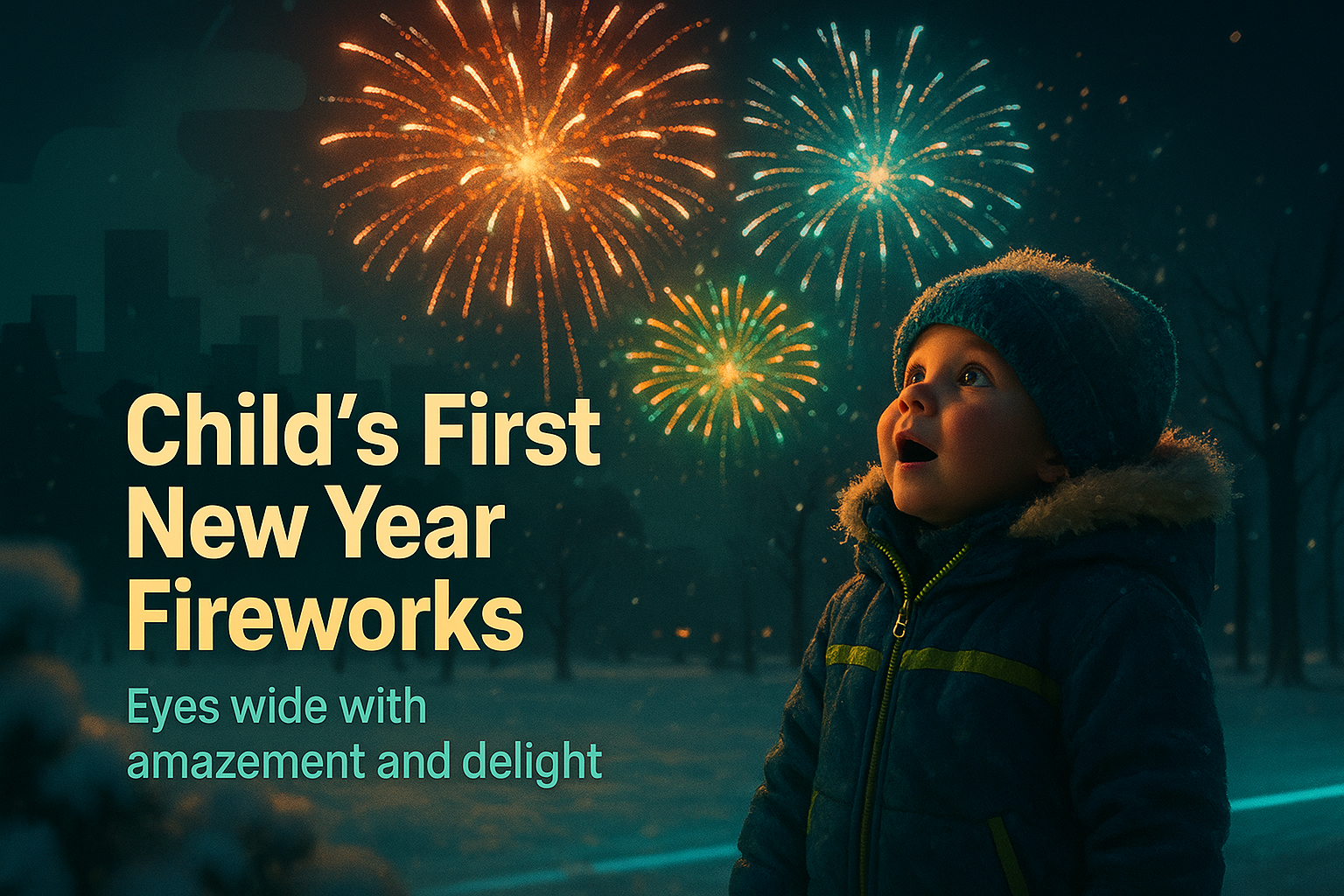 Charming image of a child mesmerized by fireworks during New Year celebrations, showcasing a winter scene with vibrant colors and a sense of wonder, ideal for family-oriented content.