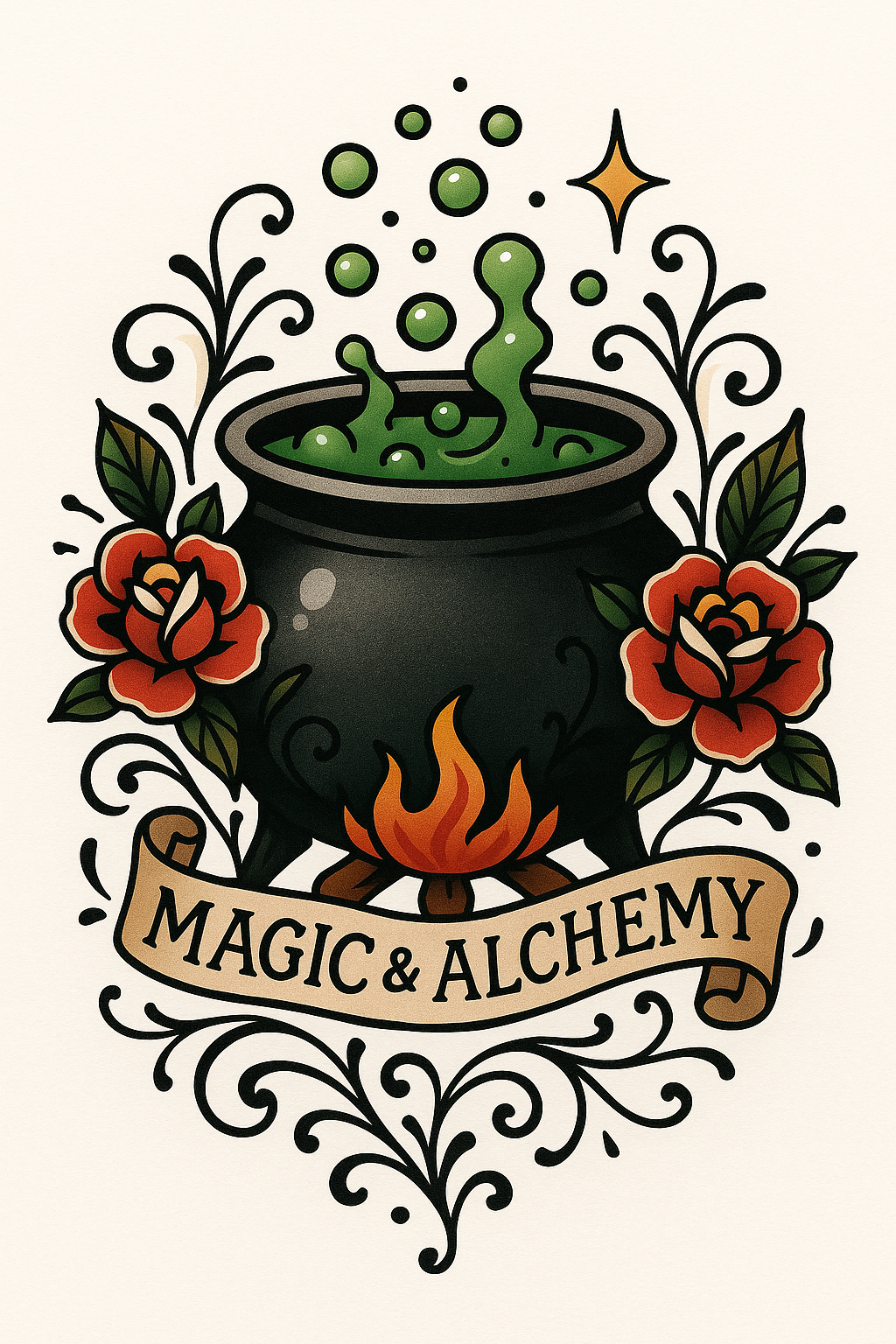/Collection: /by davooda/Type: PNG/A vibrant and whimsical illustration featuring a black cauldron with bubbling green liquid, surrounded by decorative floral elements. Ideal for fantasy-themed decor or merchandise.