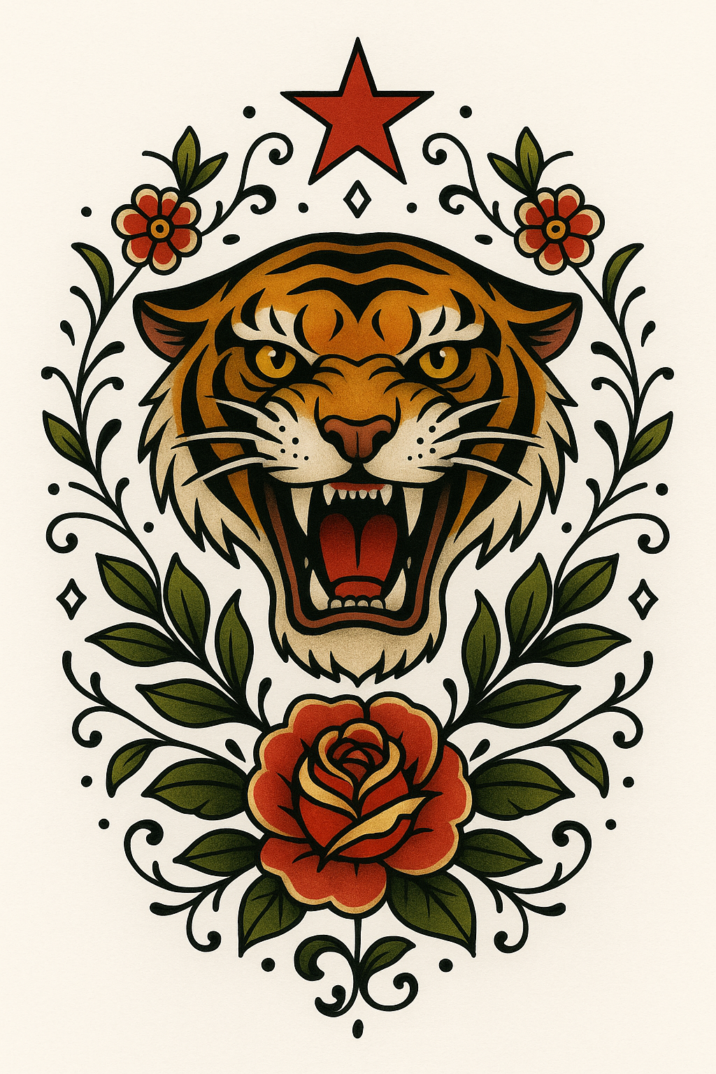 Traditional Tattoo Design Featuring a Roaring Tiger and Rose