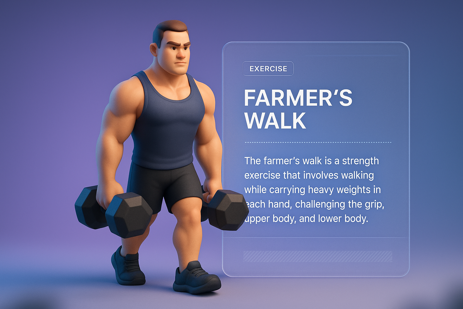 /Collection: /by davooda/Type: PNG/A 3D character performing the farmer's walk exercise, holding dumbbells. An informative block with a title and text is integrated into the design, featuring a smooth gradient background.