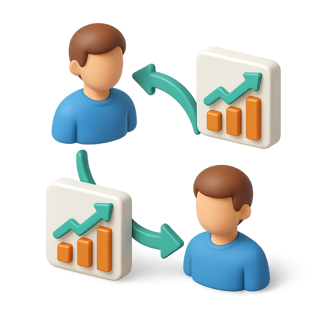 A vibrant 3D icon representing copy trading, featuring two figures with upward graphs and arrows illustrating the concept of trading interaction. The design is volumetric and has a transparent background.