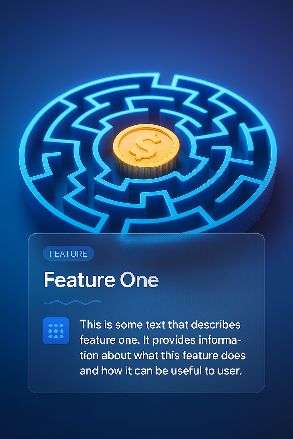 /Collection: /by davooda/Type: PNG/A vibrant 3D glowing digital maze featuring a coin at its center. Accompanied by a feature block that integrates seamlessly, showcasing information about the maze's functionality.