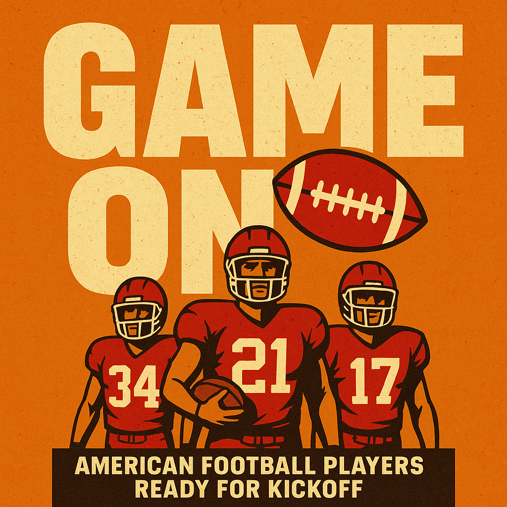 /Collection: /by davooda/Type: PNG/Dynamic illustration of American football players in a vibrant color scheme, ideal for sports promotions or event marketing. The design features bold typography and playful elements.