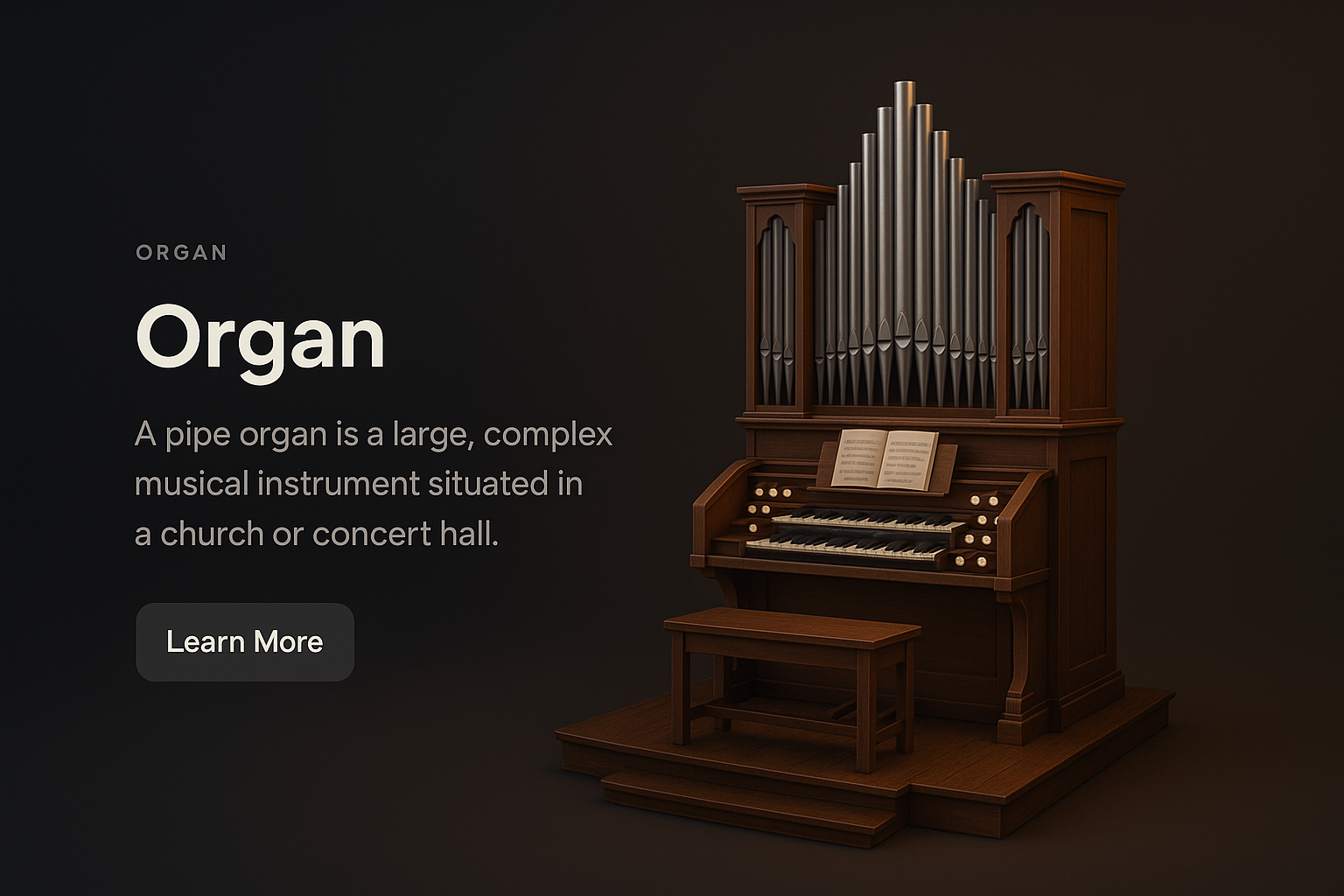 /Collection: /by davooda/Type: PNG/A realistic 3D rendering of a pipe organ displayed in a dark, gradient background. The organ features intricate details and is complemented by a text block and action button, emphasizing its grandeur.