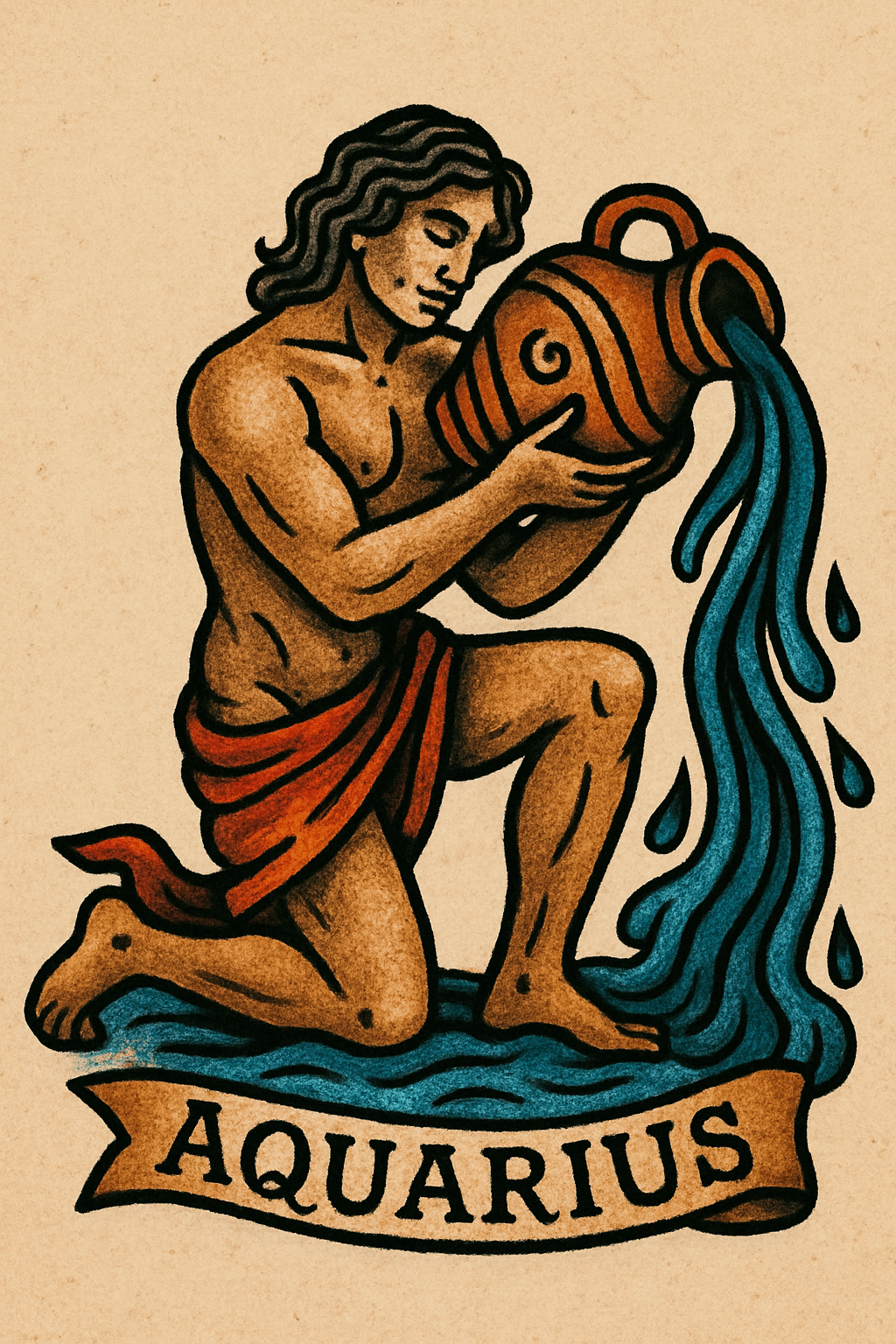 /Collection: /by davooda/Type: PNG/A detailed illustration of the Aquarius zodiac sign, featuring a muscular figure pouring water from a jug. The design is artistic and colorful, suitable for astrology-related content.