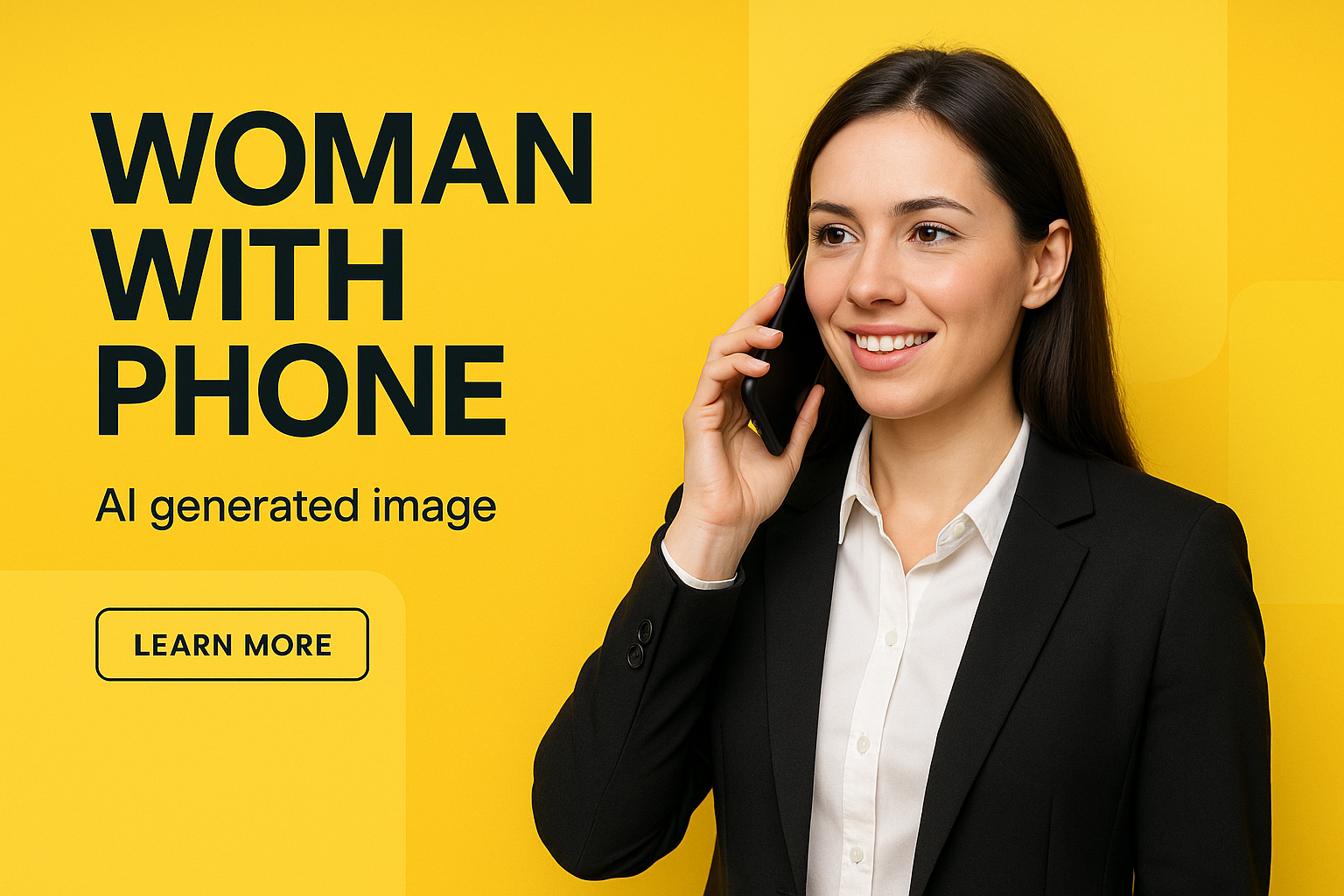 /Collection: /by davooda/Type: PNG/A woman in a professional suit is smiling while on the phone, set against a bright yellow background. The composition features bold typography and a balanced layout.