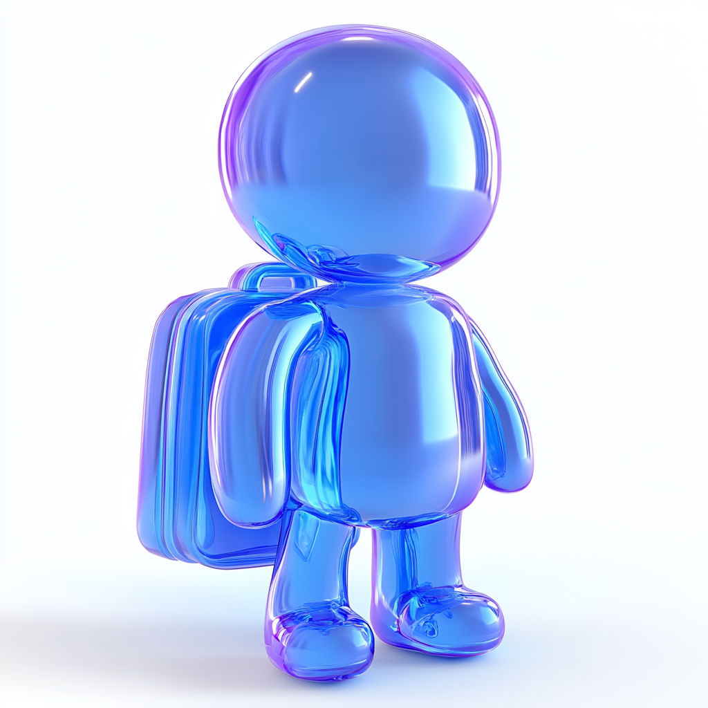 A vibrant 3D rendered character with a glossy finish, holding a suitcase. This playful design is ideal for travel-themed projects and digital illustrations.