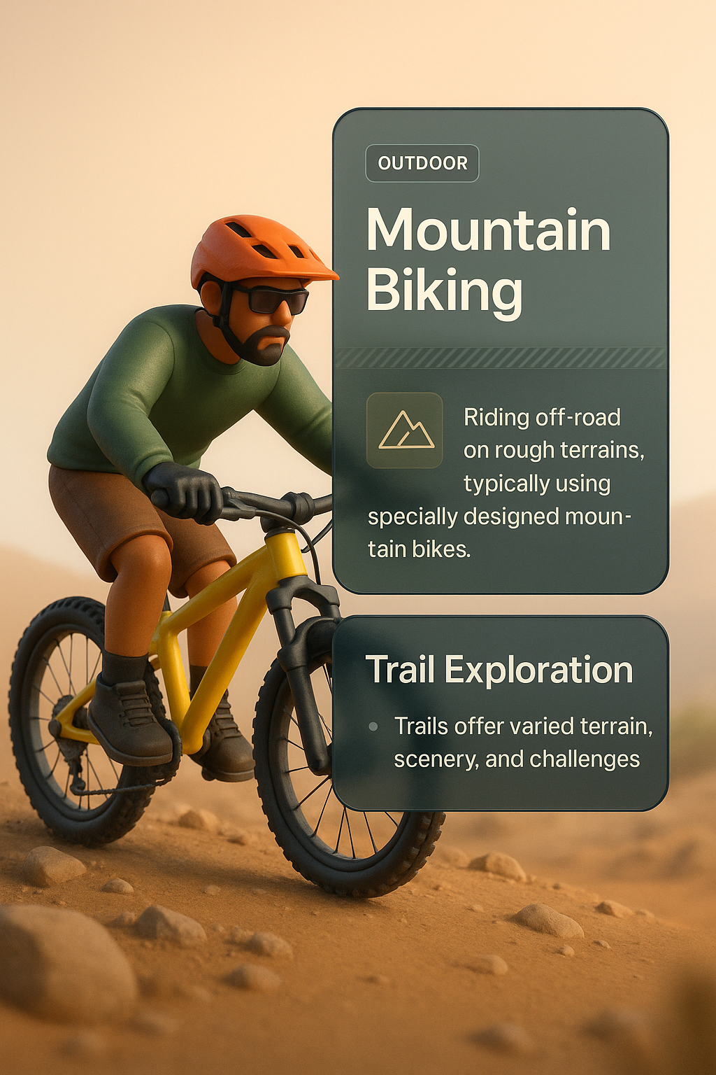 /Collection: /by davooda/Type: PNG/A vibrant 3D illustration depicting a mountain biker navigating rough terrains. The design includes layered elements, a gradient background, and informative text blocks.