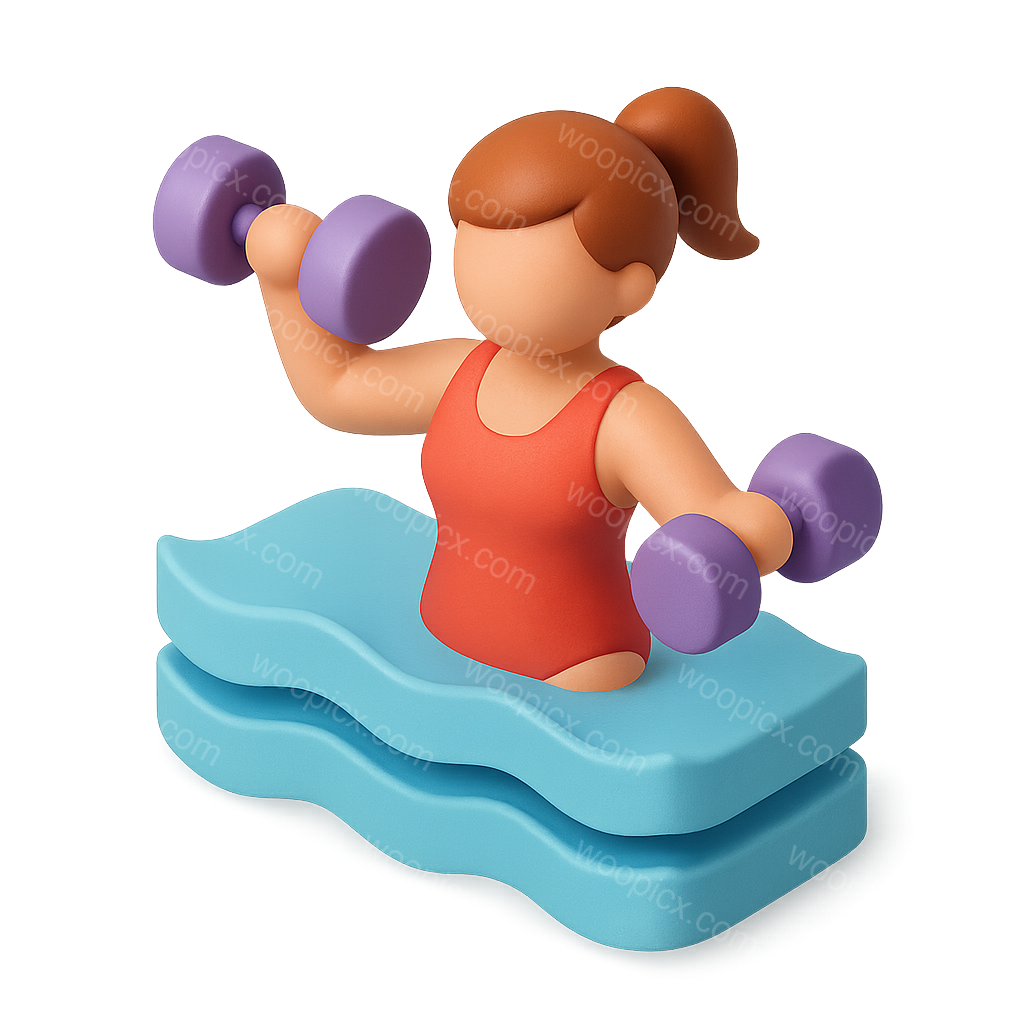 A vibrant 3D icon depicting a person engaging in aqua aerobics, lifting weights while standing in water. The character features a red swimsuit and colorful dumbbells, set against a soft gradient background.