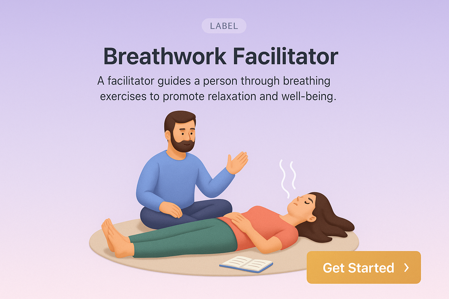 /Collection: /by davooda/Type: PNG/A detailed 3D illustration depicting a breathwork facilitator guiding a participant through relaxation exercises, set against a gradient background. The design includes small text elements and an action button.